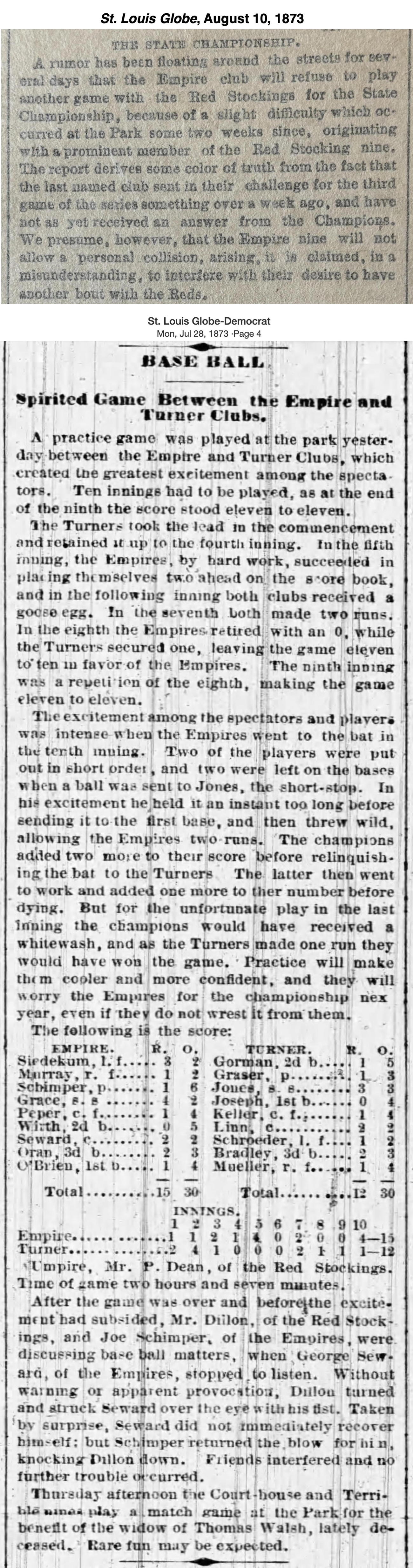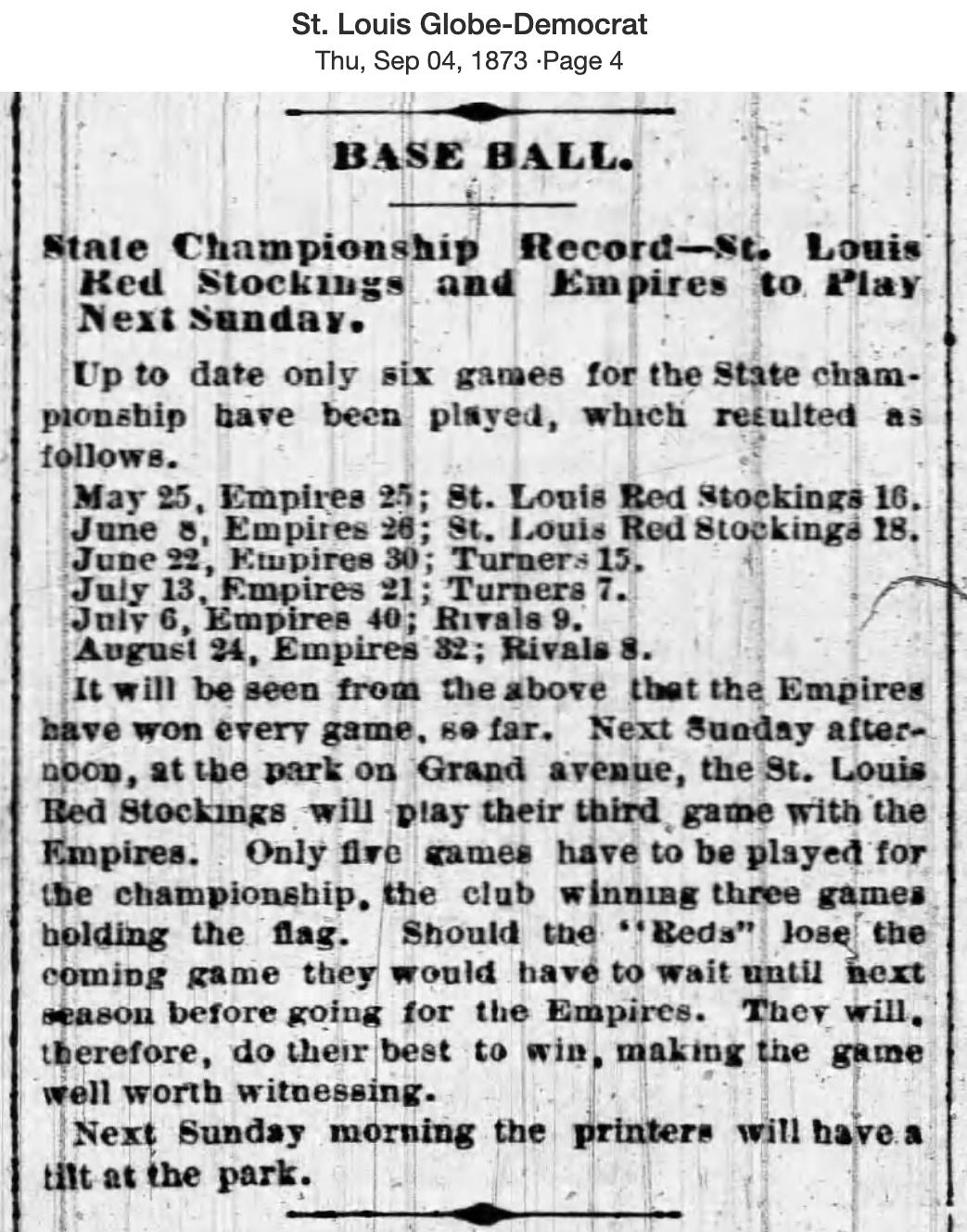 (5) "A Fine Game Betweem the Empires and the Red Stocking," St. Louis Democrat, June 9, 1873, pg. 4.