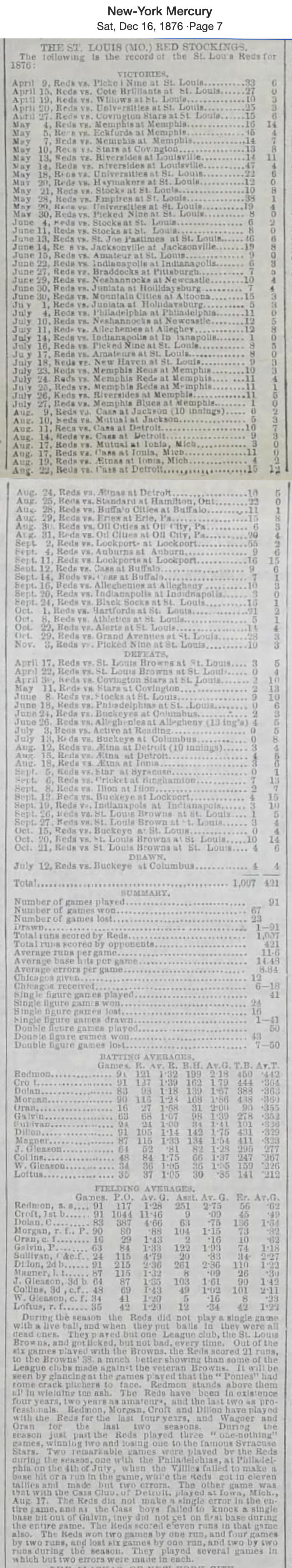 The St. Louis Globe-Deomcrat published a summary of the season on November 12, 1876. It credited the Reds with 91 games, wining 67, losing 23, with one tie. They outscored their opponents 1007 - 421. Redmond, Croft and Dillon were all credited with playing 91 games, while Morgan played 90, Magner appeared in 87, and Dolan played in 83 games. Redmond led the club with 199 hits and a .442 batting a, erage. The New York Mercury published a full list of these 91 games on December 16, 1876. Records of a few other games have been found not present on this list, bringing the total number of games up to 94 for the season, including games against Picked Nines and amateurs and exhibitions. Their record in those games is 68-25-1. The only League club they played was the Browns, against whom they were 0-6.