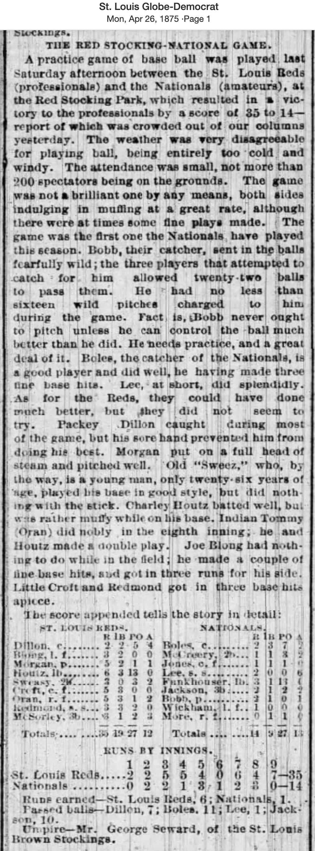 LineupPacky Dillon (c)Joe Blong (lf)Dan Morgan (p)Charlie Houtz (1b)Charlie Sweasy (2b)Art Croft (cf)Tom Oran (rf)Billy Redmond (ss)John McSorley (3b)