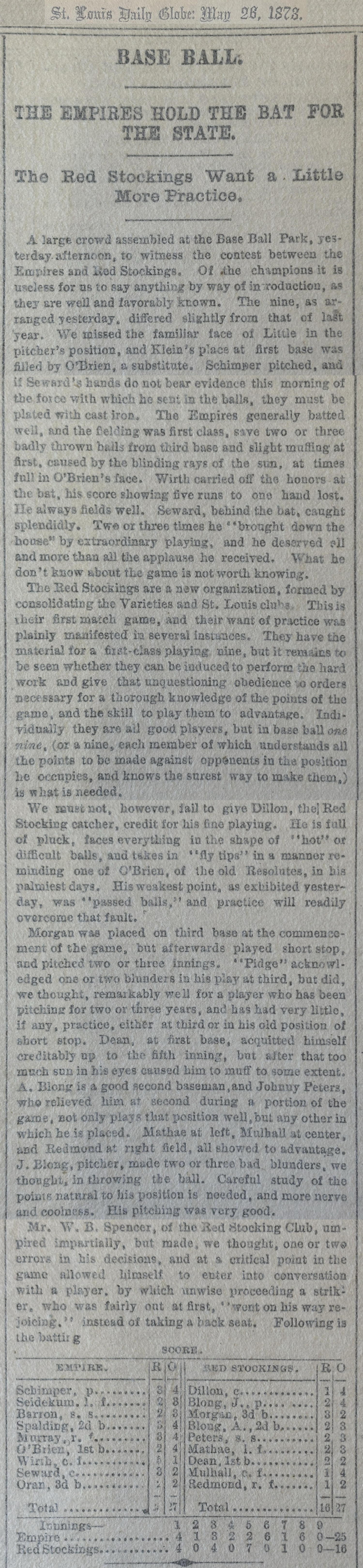 LineupPacky Dillon (c)Joe Blong (p)Dan Morgan (3b-ss-p)Andy Blong (2b)John Peters (ss-2b)George Mathae (lf)Patrick Dean (1b)Zach Mulhall (cf)Billy Redmond (rf)