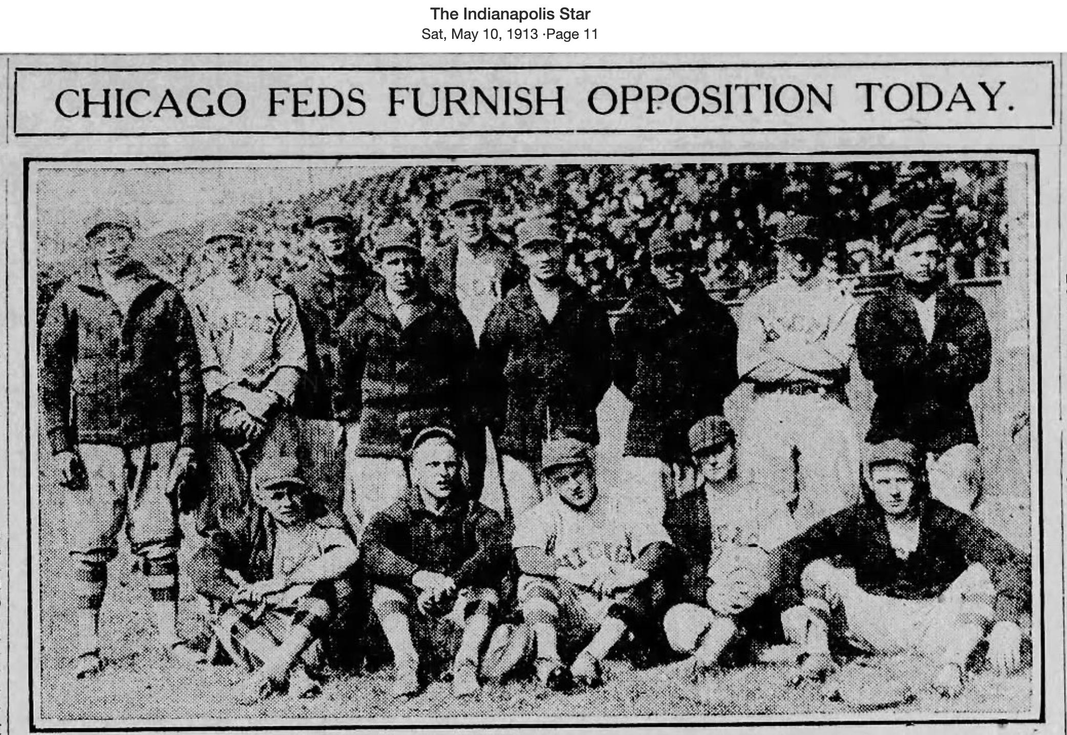 This photo was printed in the Indianapolis Star on May 10, the day of the first home game for the Indianapolis club, against Chicago. The photo did not include a caption, so the identies of the players are unknown, but one can assume they represented the club that left Chicago on the road trip that opened their season. Prior to the series in Indianapolis, Chicago played three games in St. Louis. They then played four games in Indianapolis. Between the seven games, thirteen players appeared in games for Chicago. Including manager Burt Keeley, that totals fourteen, the number of people in the photo.
