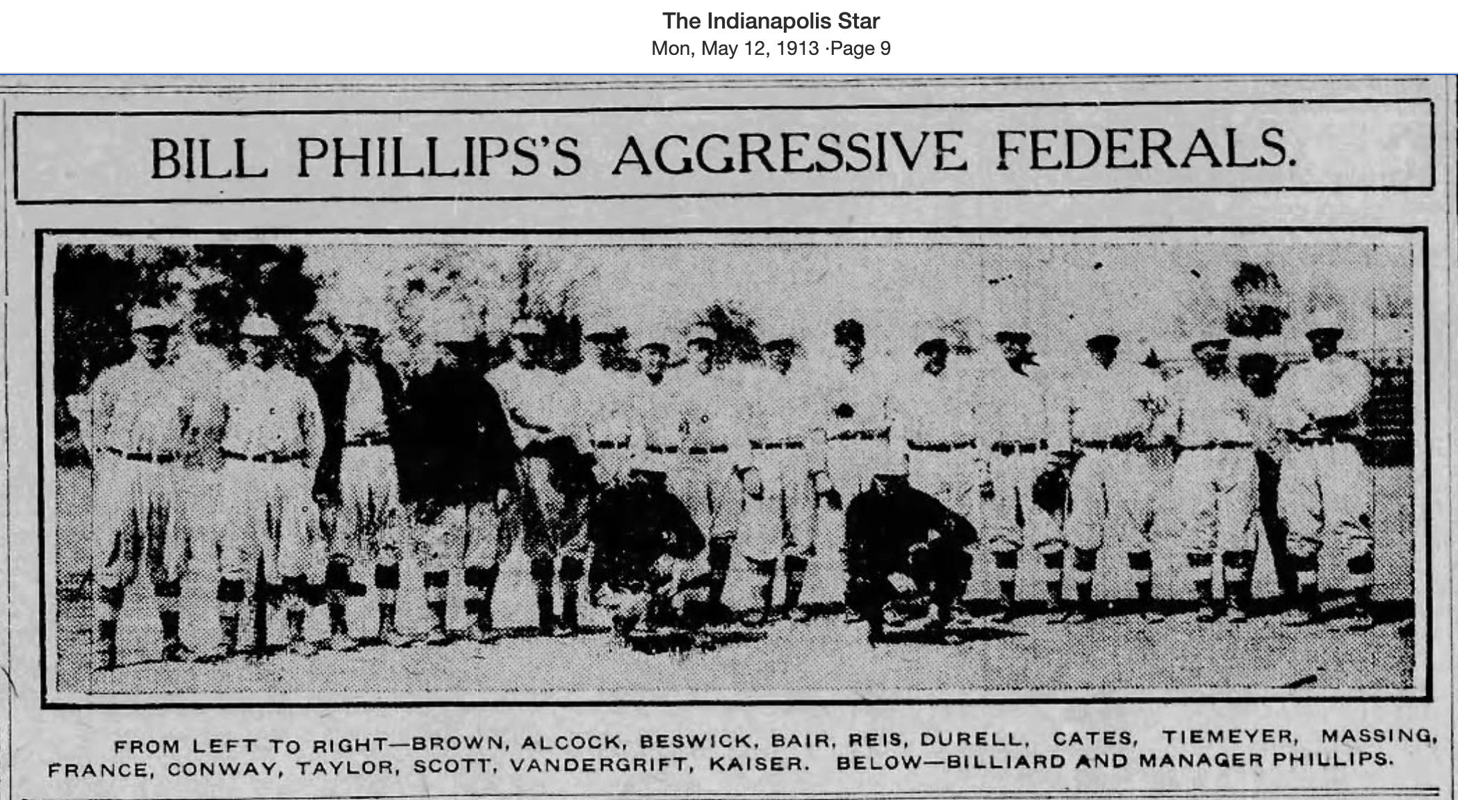 This photo was published in the Indianapolis Star on May 12, 1913, and appears to be the full club after it returned home from its opening series in Pittsburgh. The club played four games in Pittsburgh before their home opener against Chicago on May 10. Only one player who appeared in those four games does not appear in this photo: outfielder Miller. Miller played center field in the first two games against Pittsburgh and left field in the third game (swapping places with Kaiser). Conway took over left field in the fourth game, and Miller departed the club. Baseball-Reference gives his name as M. Miller He was described as "a Pittsburger" in the Indianapolis News on April 30, 1913. It seems likely that he was dropped when Conway joined the club.