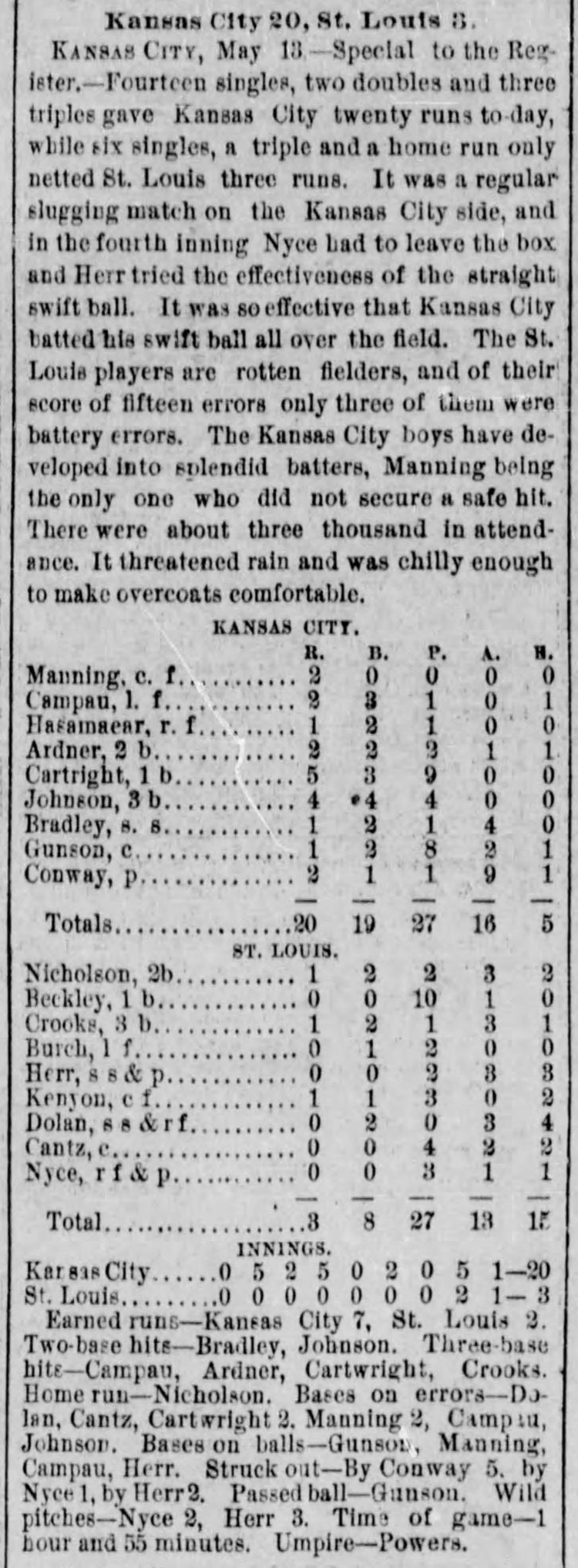 "Kansas City added two more runs to the score in the sixth inning on singles by Ardner and Bradley, Cartwright's fly to Burch, errors by Dolan and Kenyon, and Gunson's sacrifice."