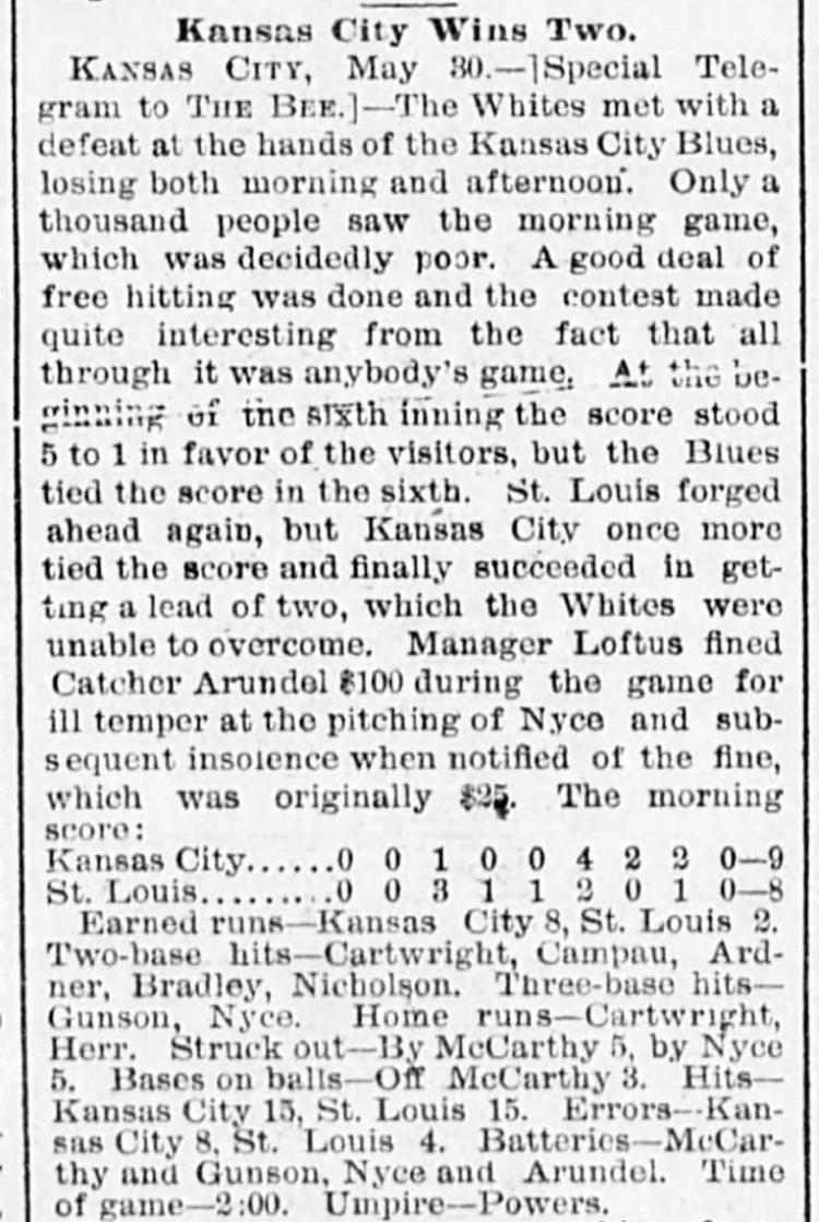 Nicholson "popped the ball over second base and took two bases on the slow handling of Bradley and Ardner".