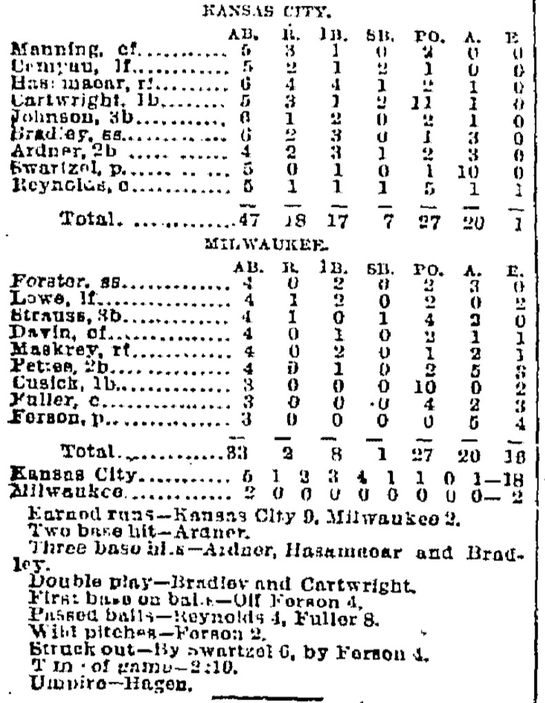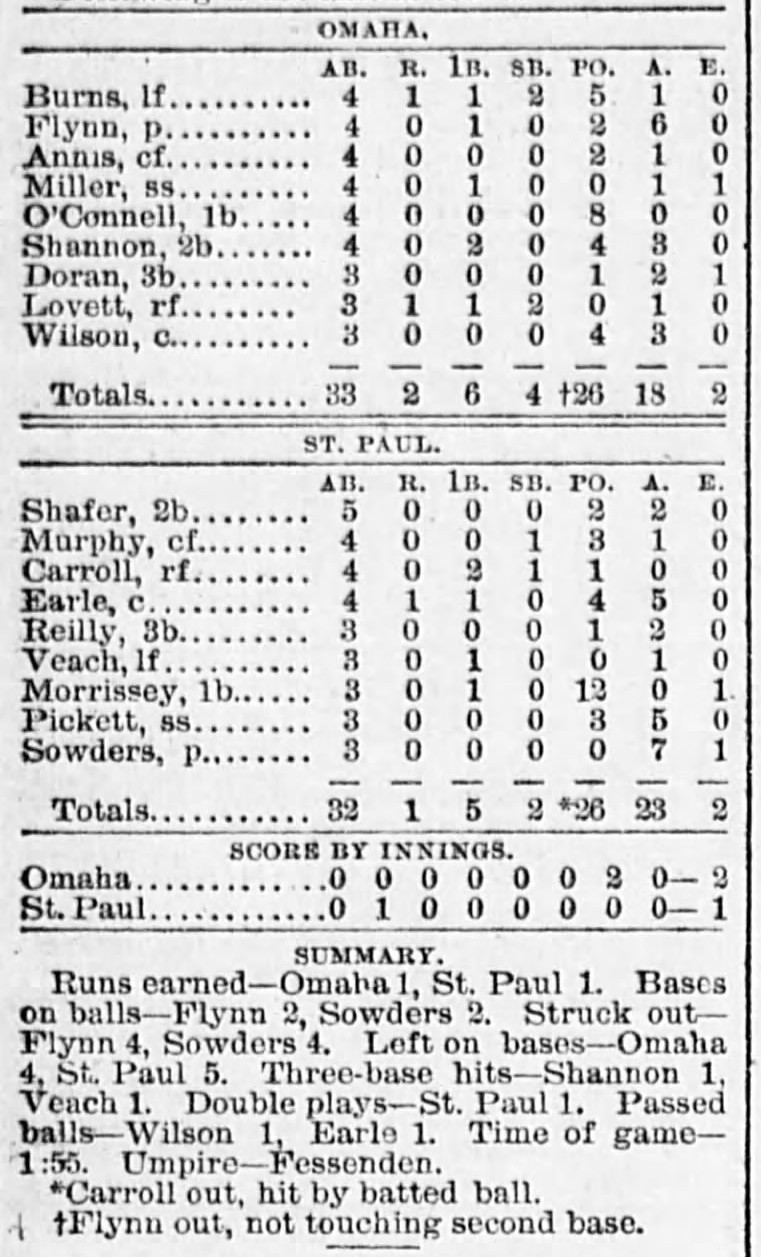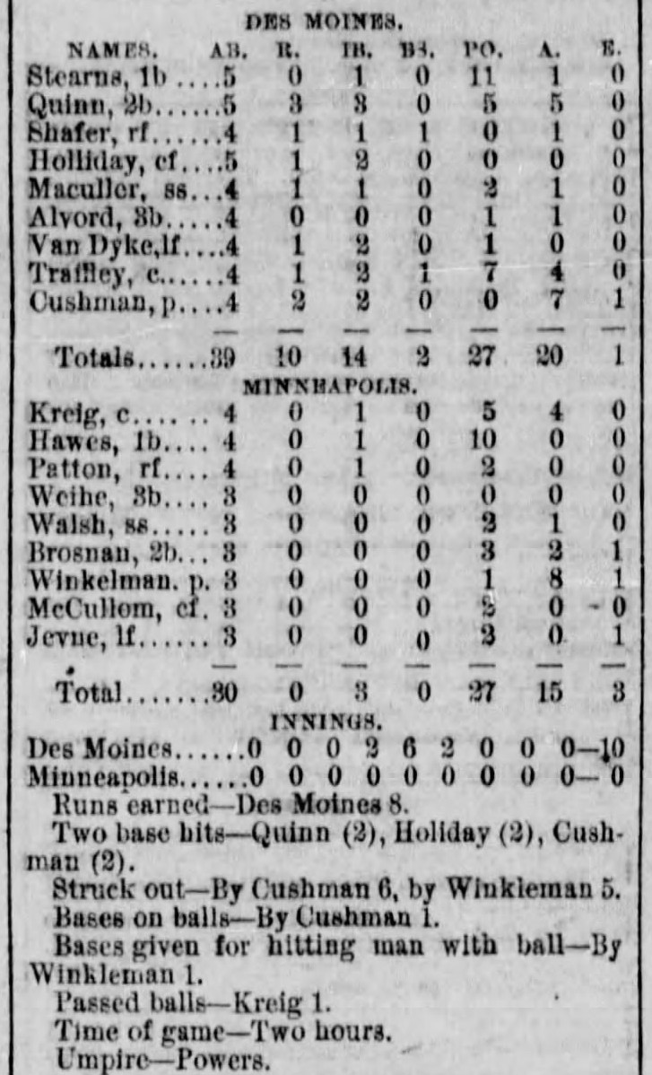 | Game 7: Minneapolis @ Des Moines Des Moines 10, Minneapolis 0 Des Moines Register ![]() | Game 8: Milwaukee @ Kansas City Kansas City 18, Milwaukee 2 Kansas City Times ![]() | Game 9: St. Paul @ Omaha Omaha 2, St. Paul 1 Omaha Daily Bee ![]() | Game 10: Chicago @ St. Louis Chicago 5, St. Louis 4 St. Louis Republican ![]() |