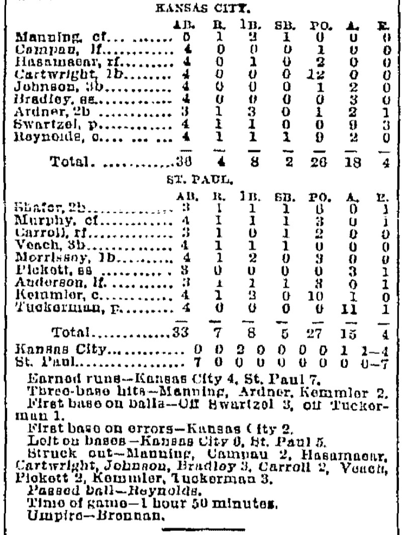 | Game 18: Des Moines @ Chicago Des Moines 14, Chicago 5 Chicago Daily News ![]() | Game 19: St. Paul @ Kansas City St. Paul 7, Kansas City 4 Kansas City Times ![]() | Game 20: Minneapolis @ St. Louis St. Louis 6, Minneapolis 2 St. Louis Republican ![]() |