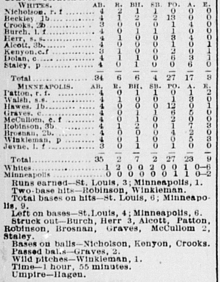 ![]() Standings at start of day | Results for May 6, 1888 Game 18: Des Moines 14, Chicago 5 Game 19: St. Paul 7, Kansas City 4 Game 20: St. Louis 6, Minneapolis 2 Milwaukee @ Omaha (Rained out) | Standings at end of dayTeam Games Wins Losses Ties Pct. |