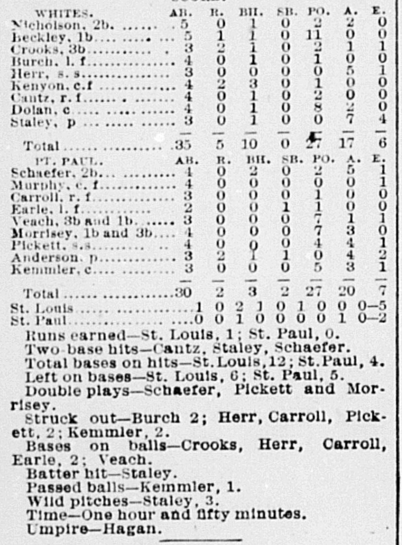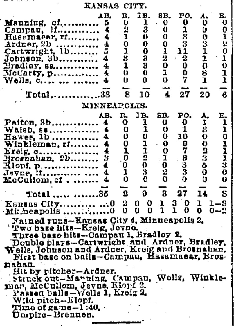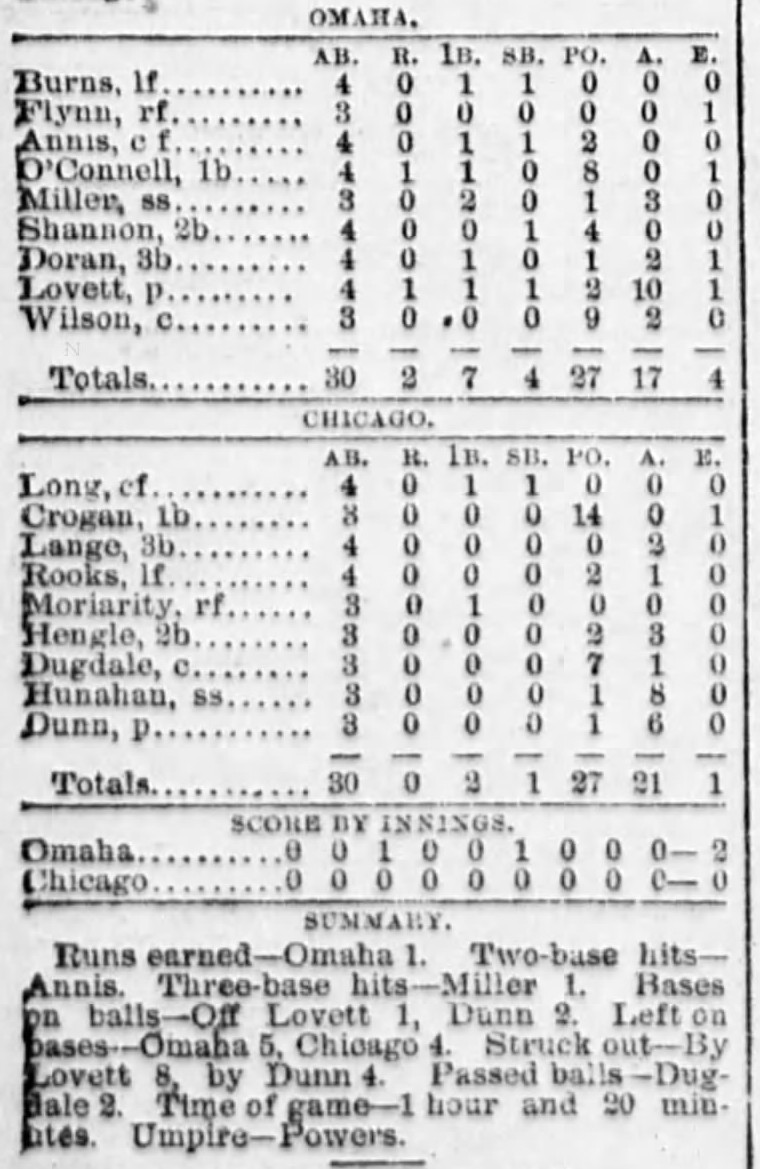| Game 23: Minneapolis @ Kansas City Kansas City 8, Minneapolis 2 Kansas City Times ![]() | Game 24: Chicago @ Omaha Omaha 2, Chicago 0 Omaha Daily Bee ![]() | Game 25: St. Paul @ St. Louis St. Louis 5, St. Paul 2 St. Louis Republican ![]() |