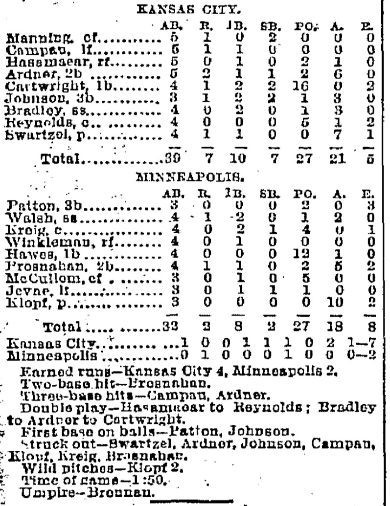 | Game 30: Minneapolis @ Kansas City Kansas City 7, Minneapolis 2 Kansas City Times ![]() |