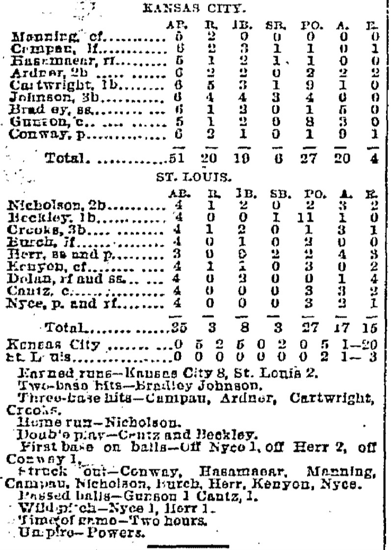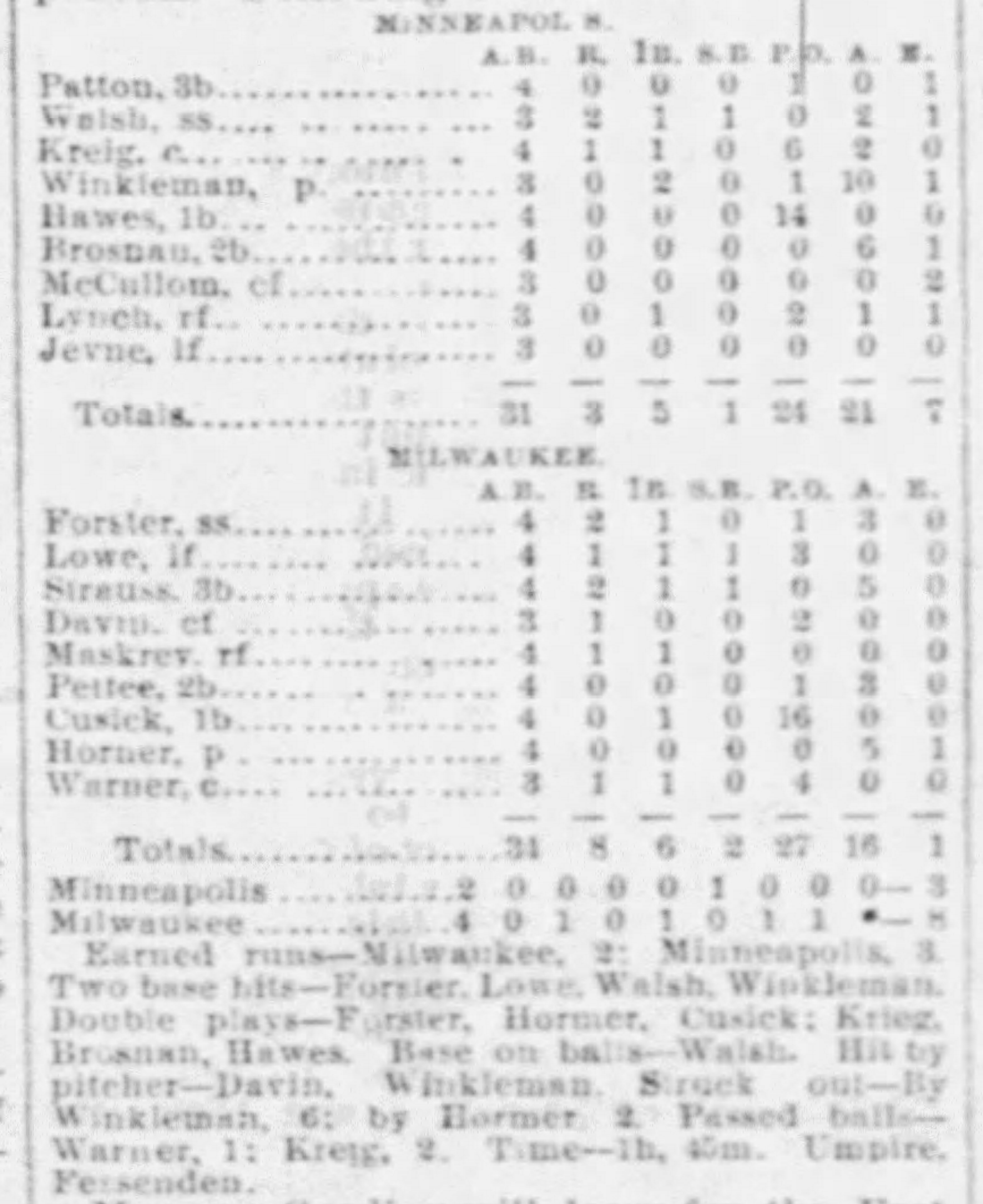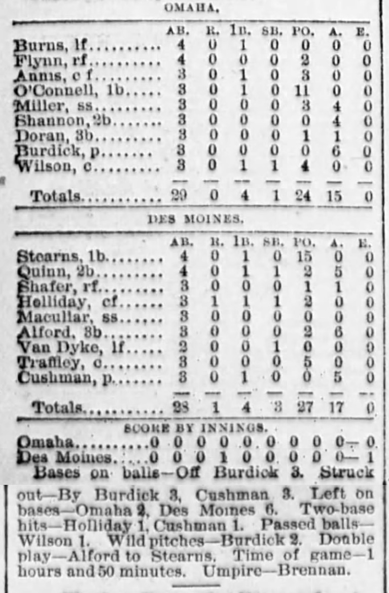 | Game 33: St. Louis @ Kansas City Kansas City 20, St. Louis 3 Kansas City Times ![]() | Game 34: Milwaukee @ Minneapolis Milwaukee 8, Minneapolis 3 Minneapolis Star Tribune ![]() | Game 35: Des Moines @ Omaha Des Moines 1, Omaha 0 Omaha Daily Bee ![]() | Game 36: Chicago @ St. Paul St. Paul 9, Chicago 5 St. Paul Globe ![]() |