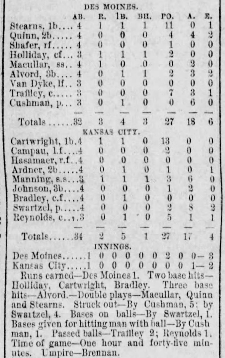| Game 62: Kansas City @ Des Moines Des Moines 3, Kansas City 2 Des Moines Register ![]() | Game 63: St. Paul @ Minneapolis Minneapolis 12, St. Paul 5 Minneapolis Star Tribune ![]() | Game 64: Omaha @ St. Louis St. Louis 5, Omaha 2 St. Louis Republican ![]() |