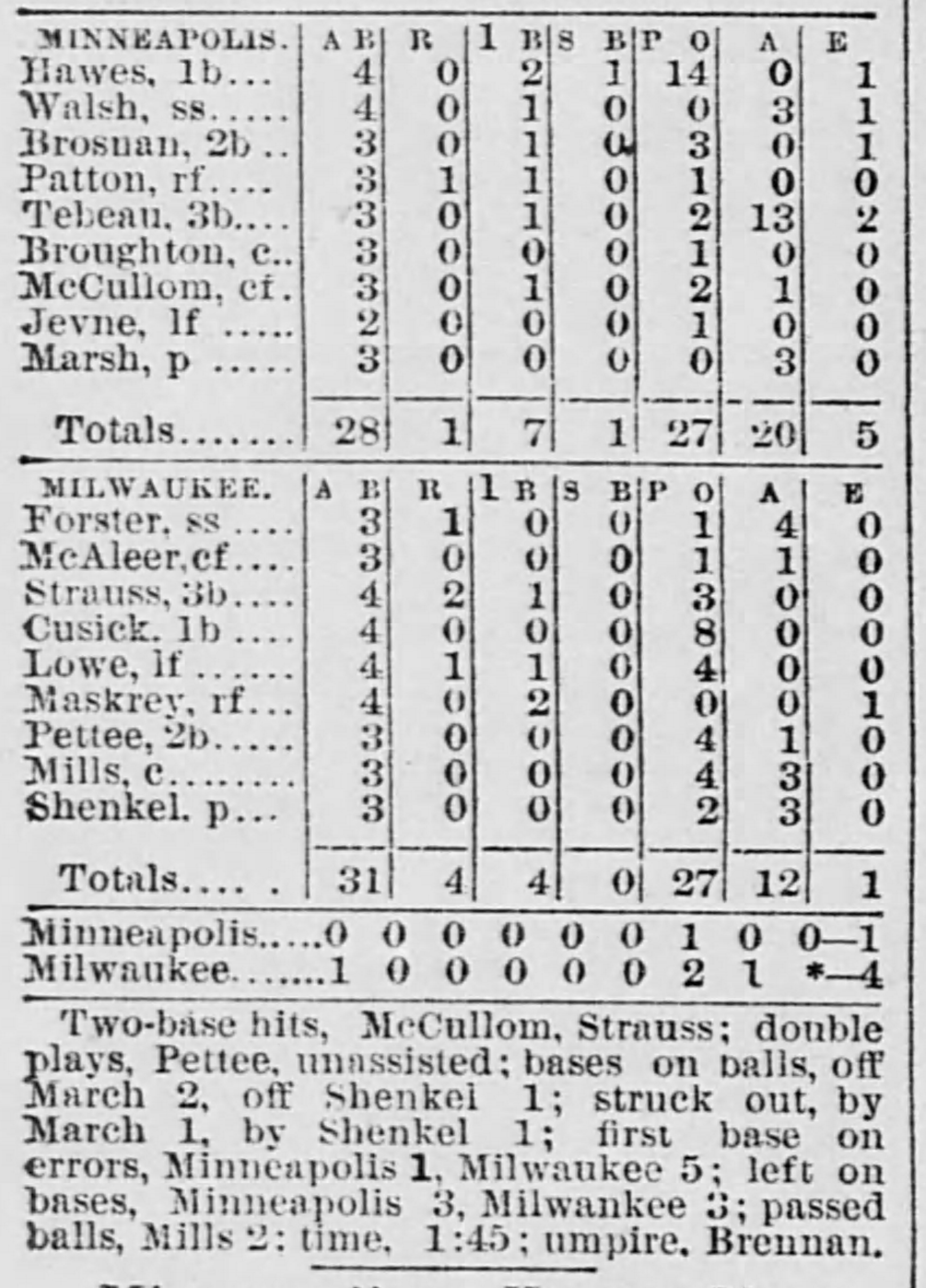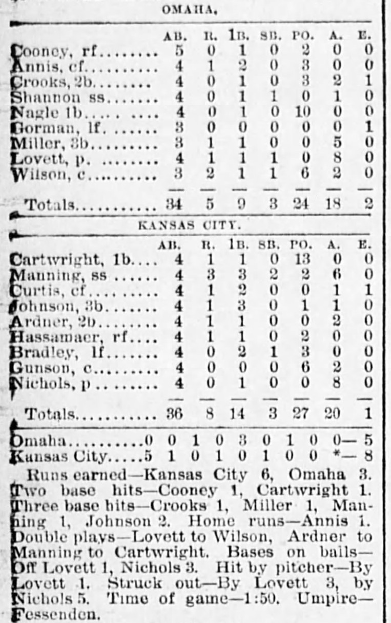 | Game 185: Sioux City @ Des Moines Des Moines 12, Sioux City 0 Sioux City Journal ![]() | Game 186: Milwaukee @ Minneapolis Milwaukee 4, Minneapolis 1 St. Paul Globe ![]() | Game 187: Kansas City @ Omaha Kansas City 8, Omaha 5 Omaha Daily Bee ![]() |