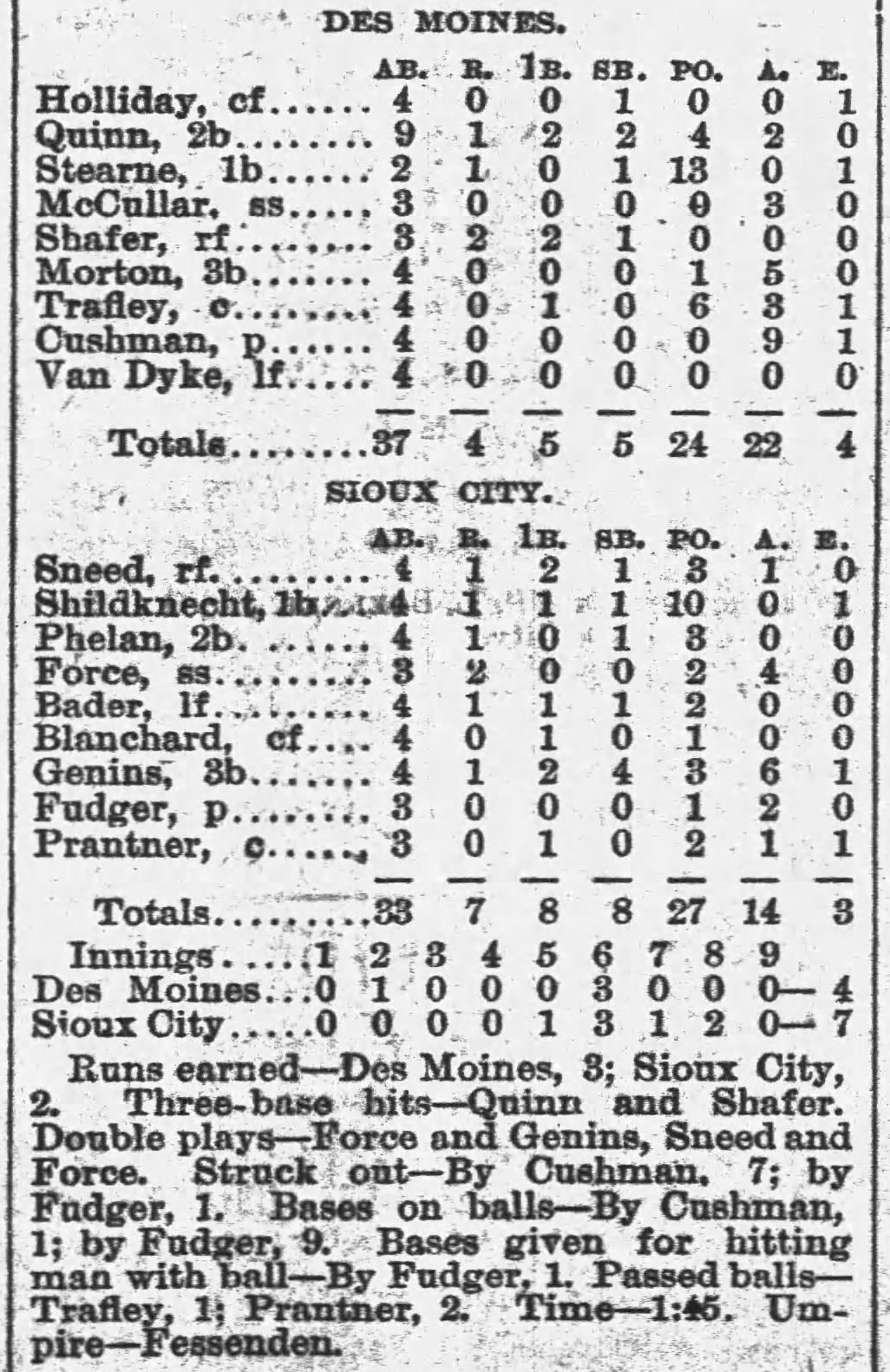 | Game 217: Sioux City @ Des Moines Sioux City 7, Des Moines 4 Sioux City Journal ![]() | Game 218: Milwaukee @ Minneapolis Milwaukee 6, Minneapolis 5 Minneapolis Star Tribune ![]() | Game 219: Kansas City @ Omaha Omaha 6, Kansas City 0 Omaha Daily Bee ![]() | Game 220: Chicago @ St. Paul St. Paul 11, Chicago 3 St. Paul Globe ![]() |