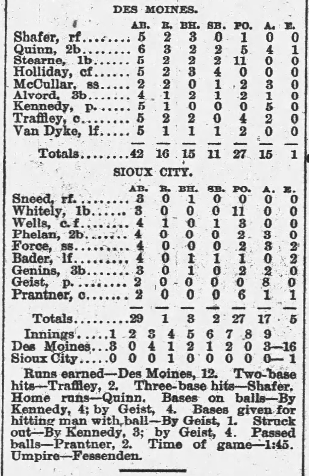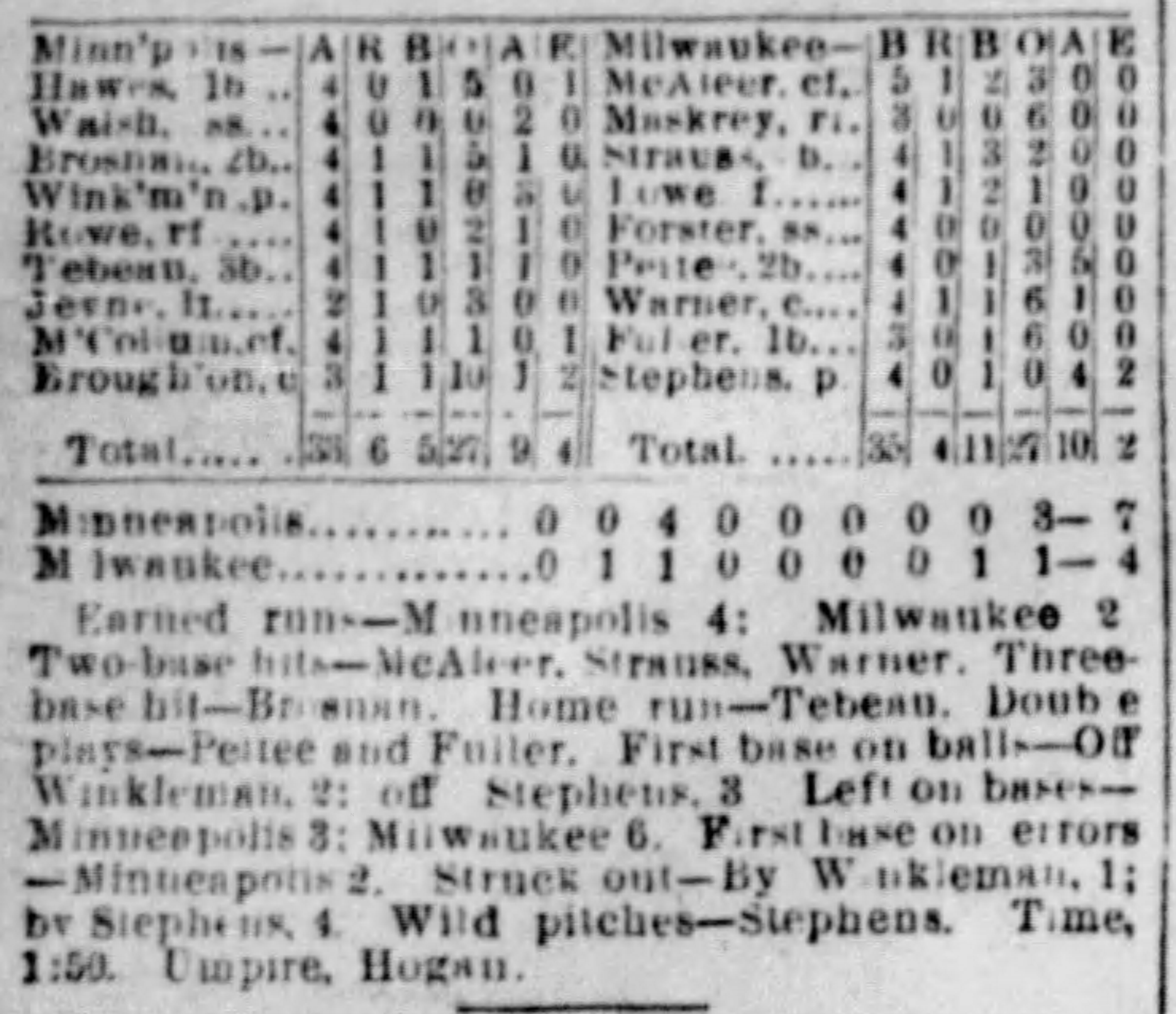 | Game 225: Sioux City @ Des Moines Des Moines 16, Sioux City 1 Sioux City Journal ![]() | Game 226: Milwaukee @ Minneapolis Minneapolis 7, Milwaukee 4 Minneapolis Star Tribune ![]() | Game 227: Kansas City @ Omaha Omaha 6, Kansas City 5 Omaha Daily Bee ![]() | Game 228: Chicago @ St. Paul St. Paul 8, Chicago 3 St. Paul Globe ![]() |