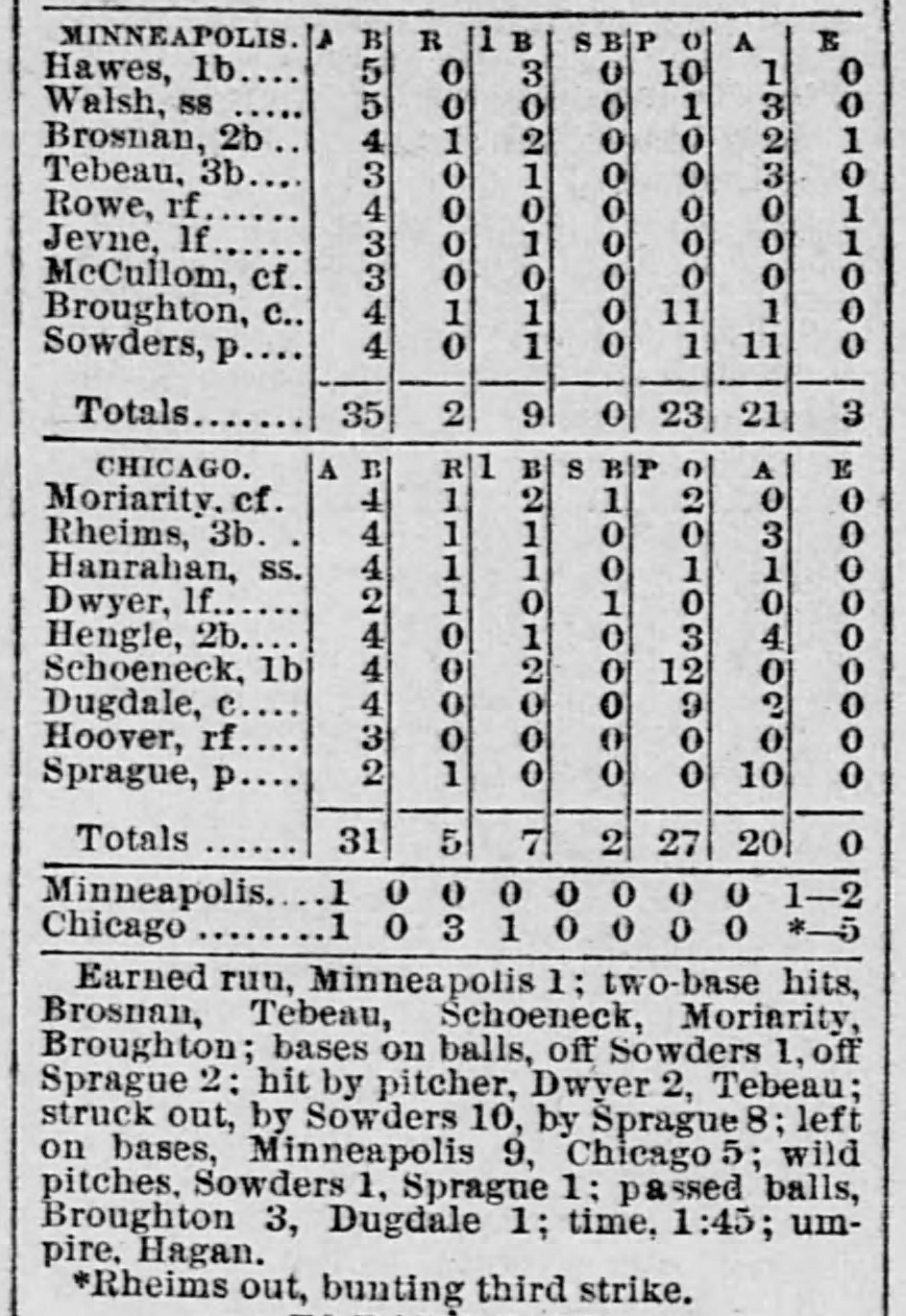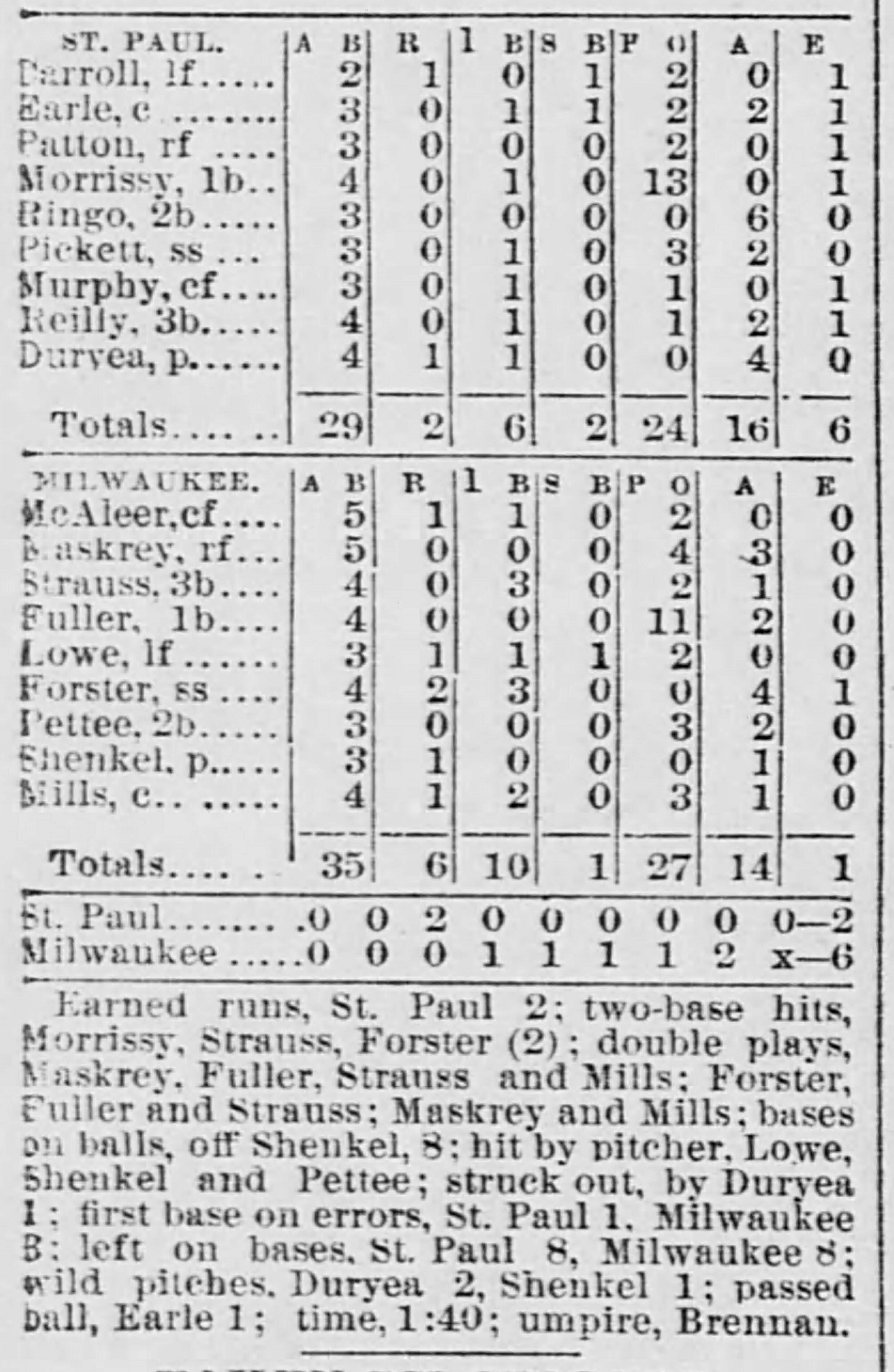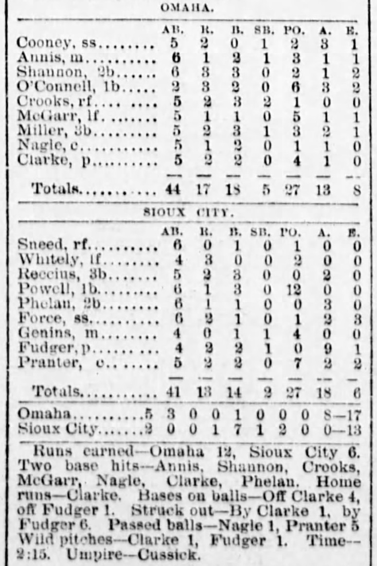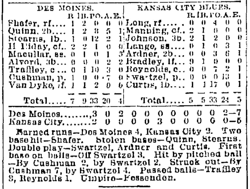 | Game 229: Kansas City @ Des Moines Des Moines 7, Kansas City 5 Kansas City Times ![]() | Game 230: Chicago @ Minneapolis Chicago 5, Minneapolis 2 St. Paul Globe ![]() | Game 231: Sioux City @ Omaha Omaha 17, Sioux City 13 Omaha Daily Bee ![]() | Game 232: Milwaukee @ St. Paul Milwaukee 6, St. Paul 2 St. Paul Globe ![]() |