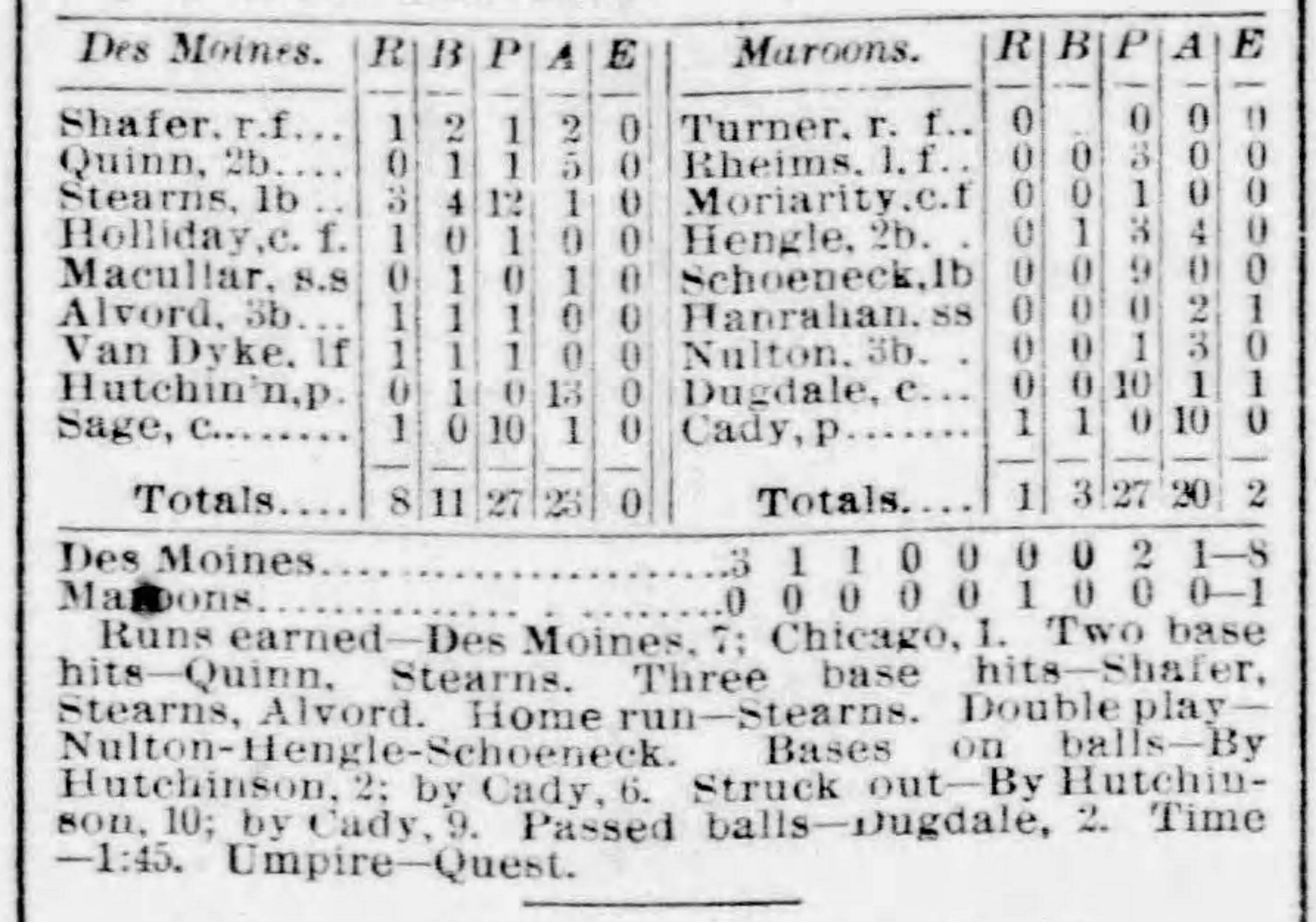 ![]() Standings at start of day | Results for August 6, 1888 Game 286: Des Moines 8, Chicago 1 Game 287: Kansas City 5, Minneapolis 2 Game 288: Omaha 2, Milwaukee 1 St. Paul @ Sioux City (Rained out) | Standings at end of dayTeam Games Wins Losses Ties Pct. |