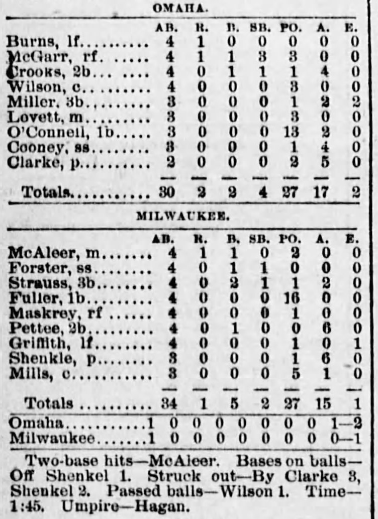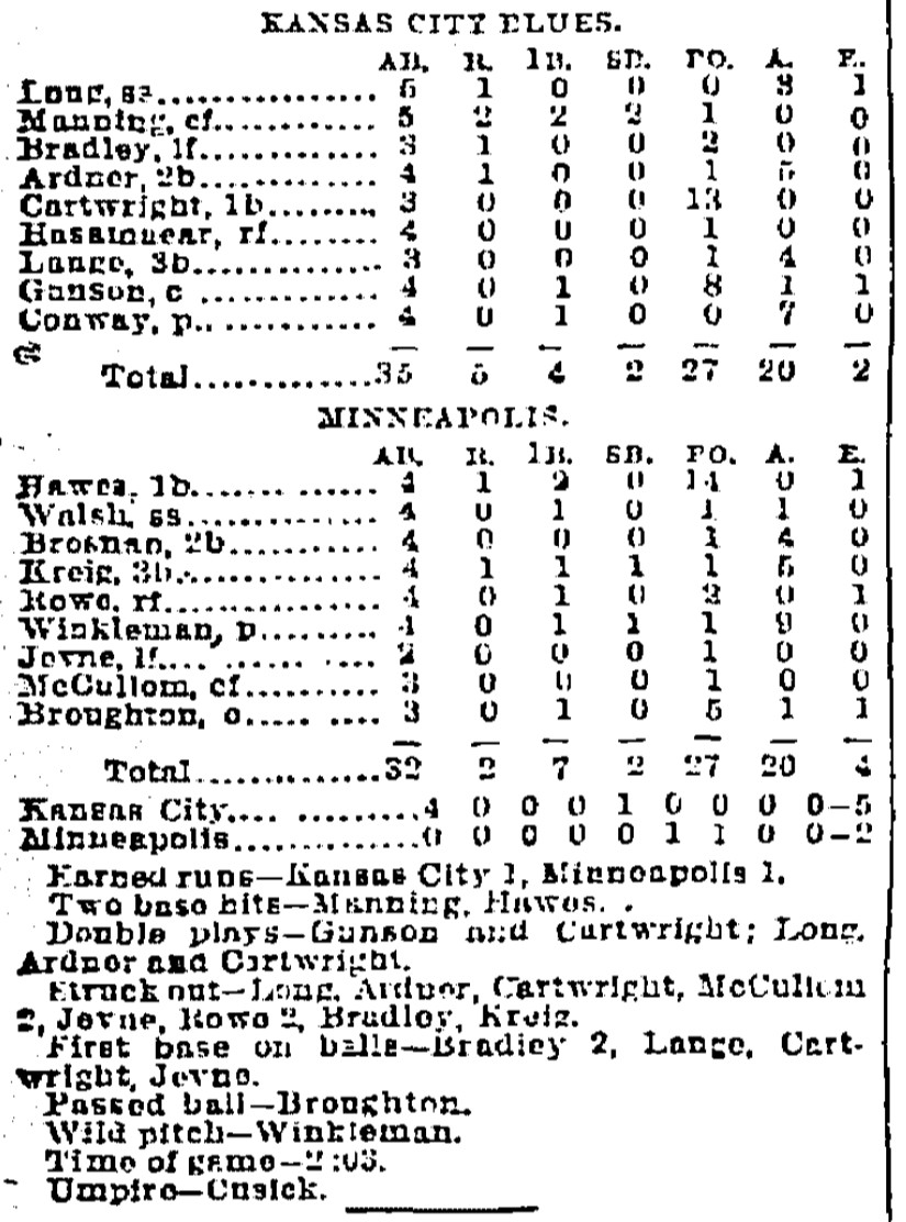 | Game 286: Chicago @ Des Moines Des Moines 8, Chicago 1 Chicago Tribune ![]() | Game 287: Minneapolis @ Kansas City Kansas City 5, Minneapolis 2 Kansas City Times ![]() | Game 288: Milwaukee @ Omaha Omaha 2, Milwaukee 1 Omaha Daily Bee ![]() |