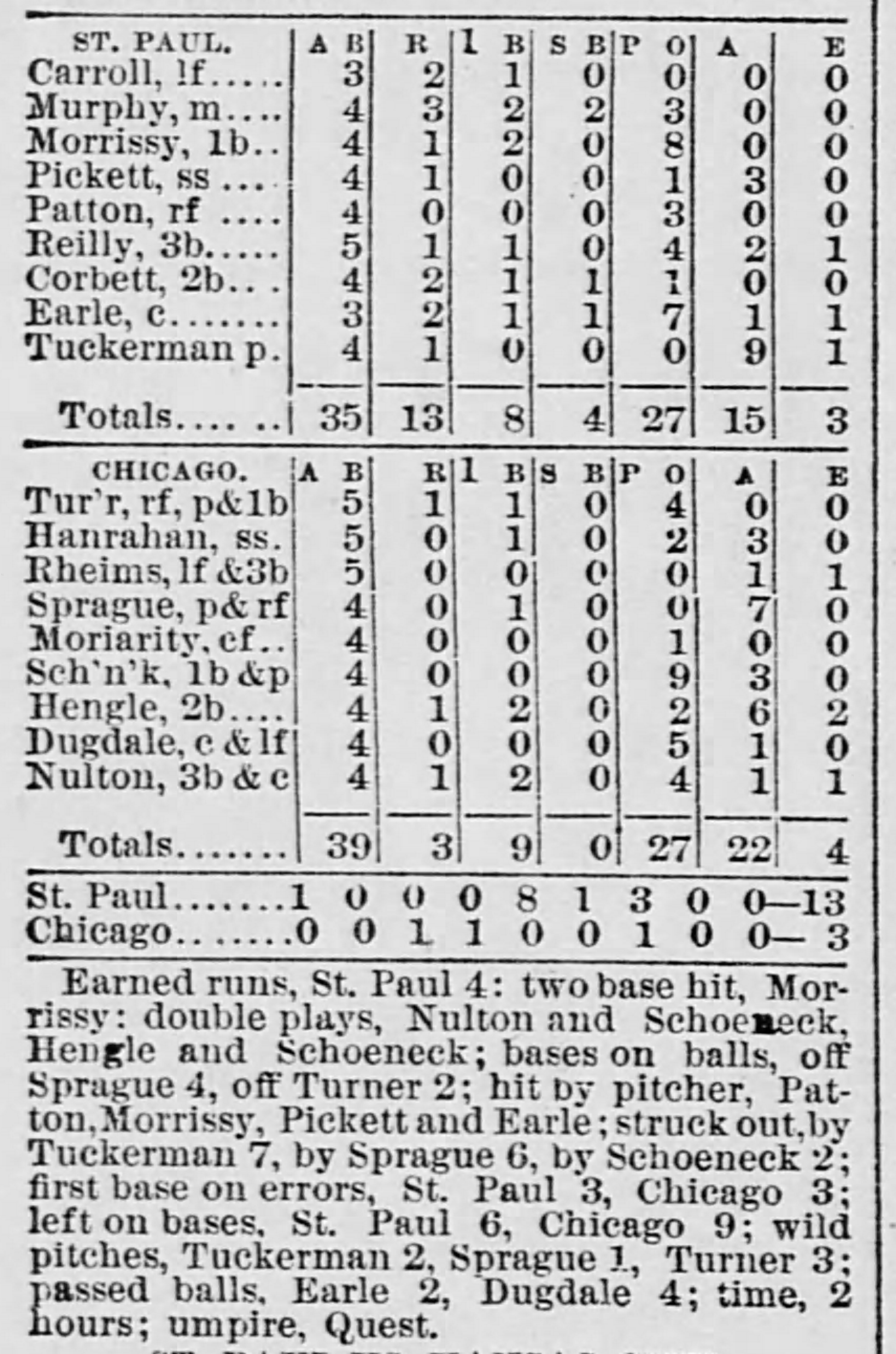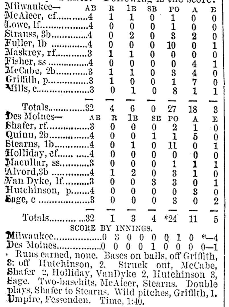 | Game 300: Chicago @ St. Paul St. Paul 13, Chicago 3 St. Paul Globe ![]() | Game 301: Des Moines @ Milwaukee Milwaukee 4, Des Moines 1 Milwaukee Sentinel ![]() |