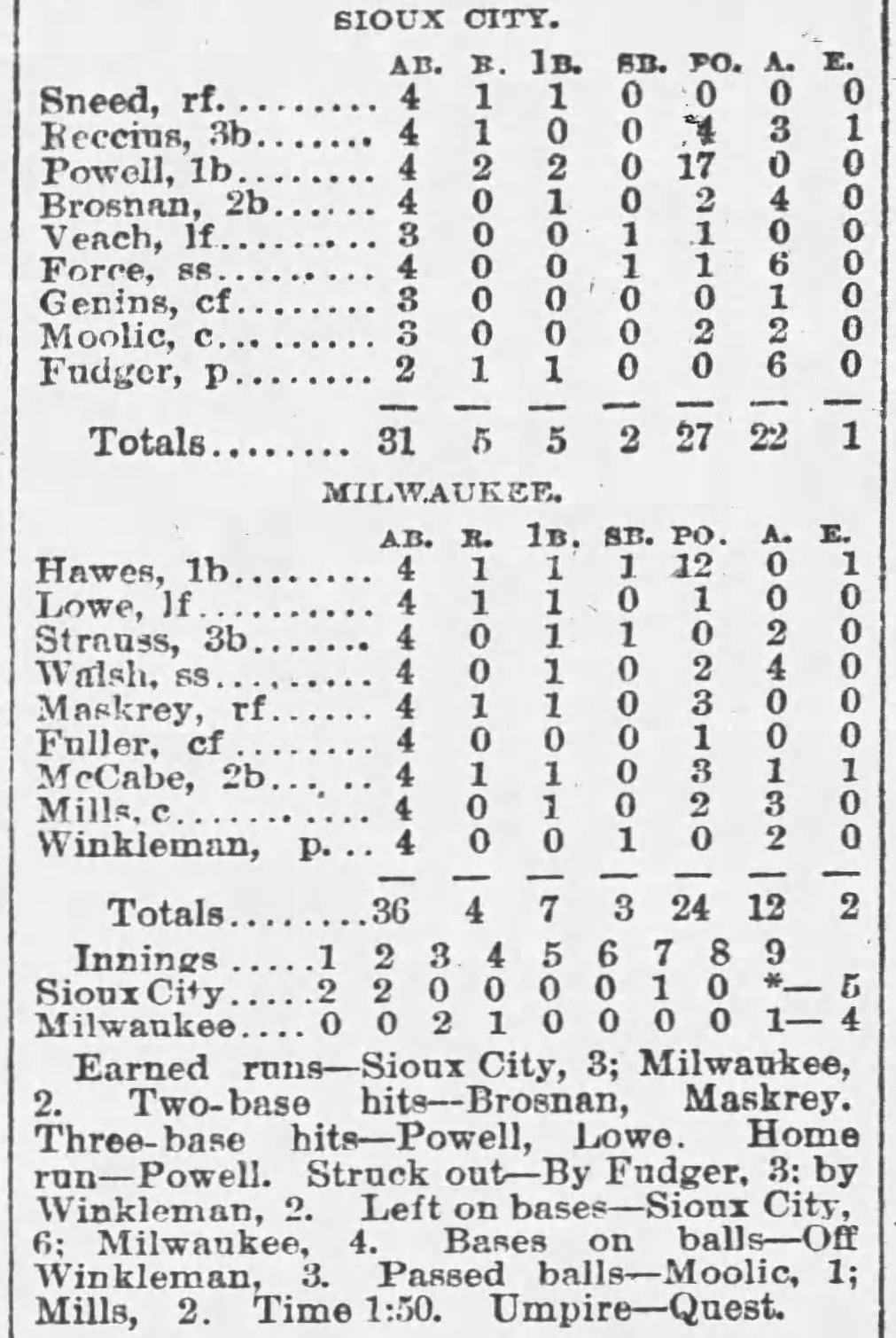 | Game 359: Chicago @ Kansas City Kansas City 7, Chicago 5 Kansas City Times ![]() | Game 360: Milwaukee @ Sioux City Sioux City 5, Milwaukee 4 Sioux City Journal ![]() |