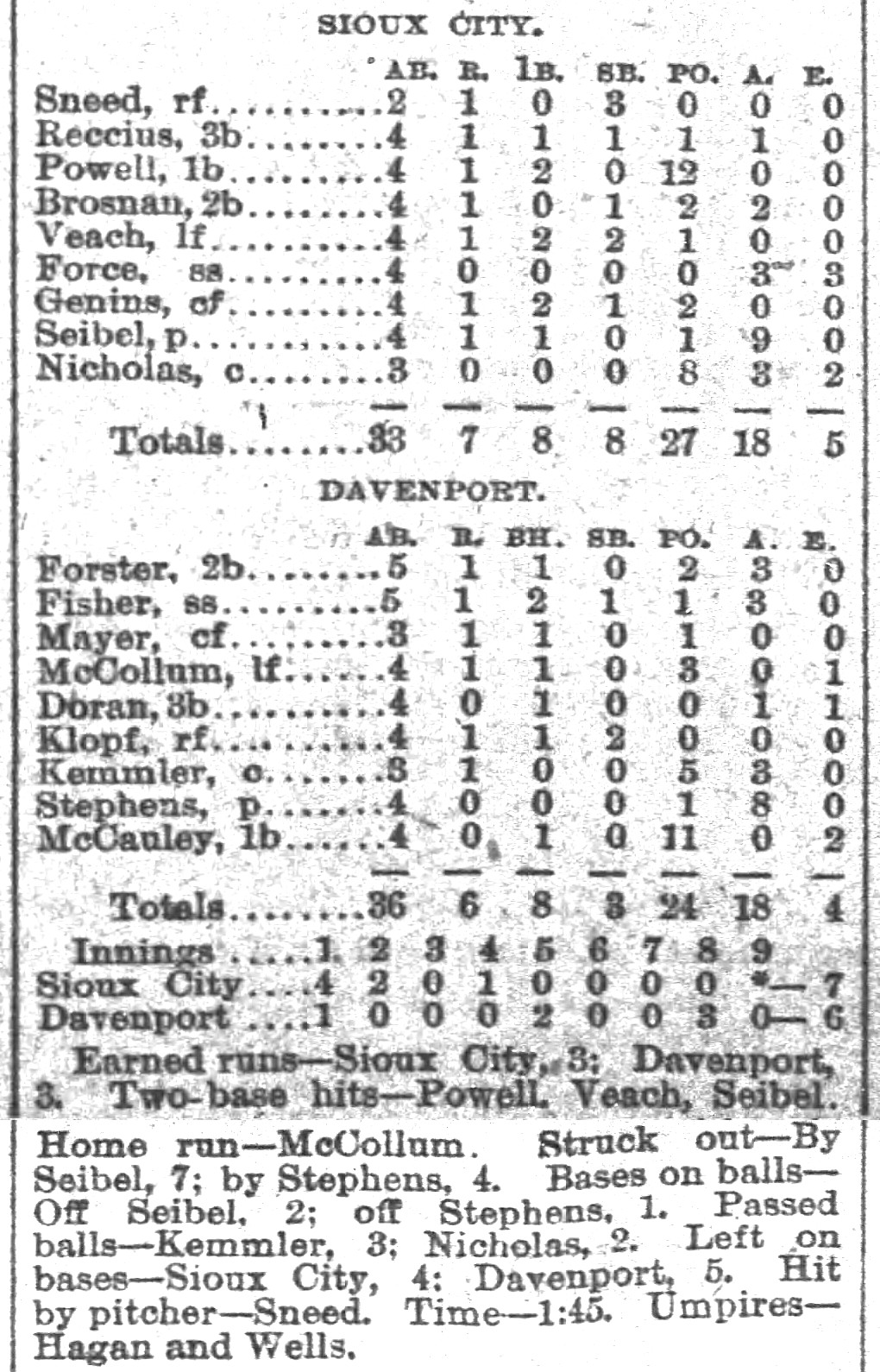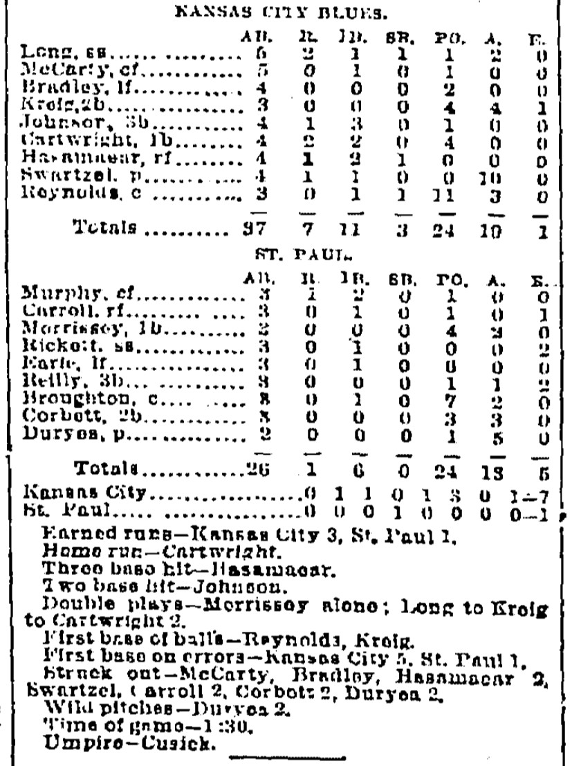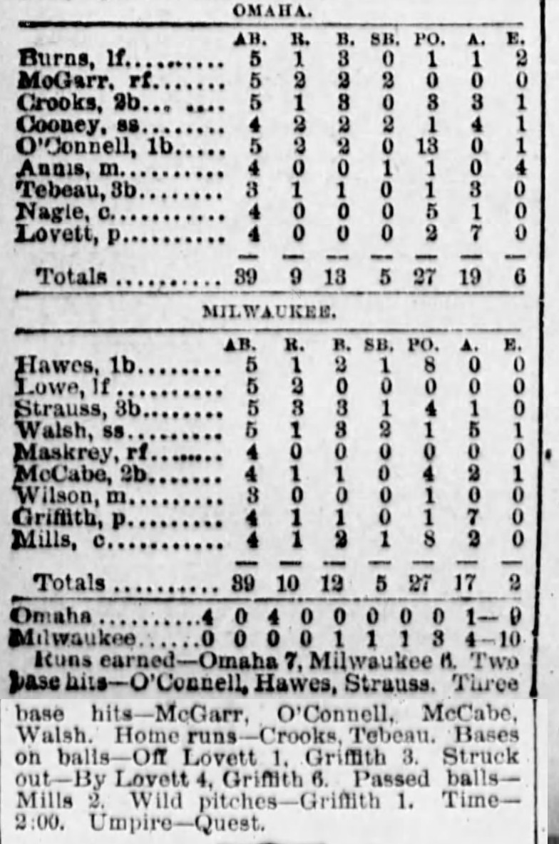 | Game 395: St. Paul @ Kansas City Kansas City 4, St. Paul 3 Kansas City Times ![]() Game 1 | Game 396: St. Paul @ Kansas City Kansas City 7, St. Paul 1 Kansas City Times ![]() Game 2 | Game 397: Milwaukee @ Omaha Milwaukee 10, Omaha 9 Omaha Daily Bee ![]() | Game 398: Davenport @ Sioux City Davenport 7, Sioux City 2 Sioux City Journal ![]() Game 1 | Game 399: Davenport @ Sioux City Sioux City 7, Davenport 6 Sioux City Journal ![]() Game 2 |