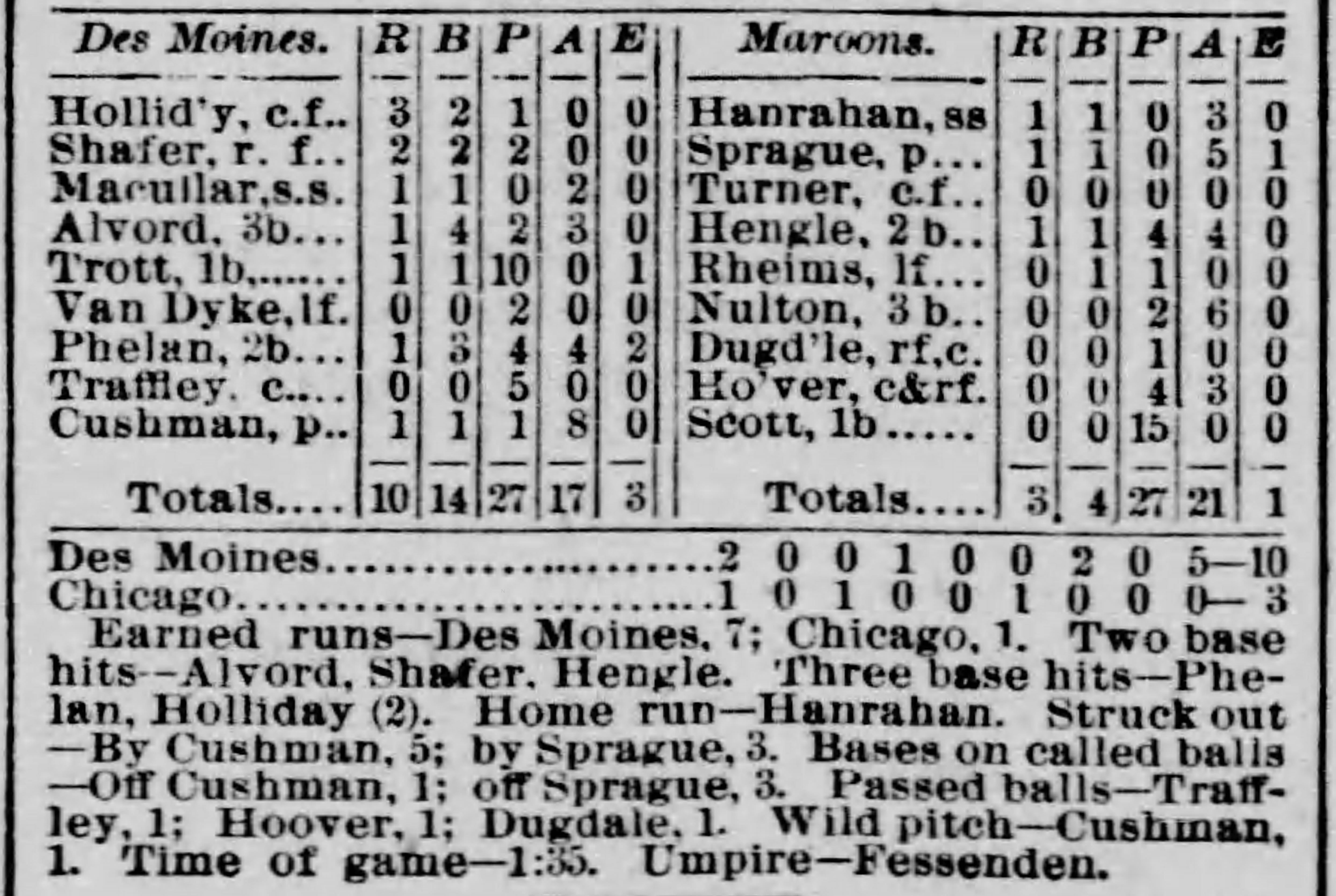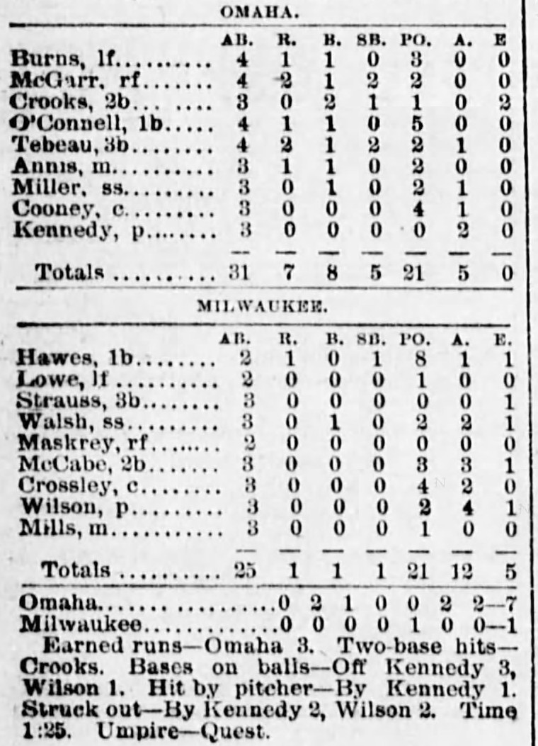 | Game 400: Chicago @ Des Moines Des Moines 9, Chicago 0 Chicago Tribune ![]() Game 1 | Game 401: Chicago @ Des Moines Des Moines 10, Chicago 3 Chicago Tribune ![]() Game 2 | Game 402: Milwaukee @ Omaha Omaha 7, Milwaukee 1 Omaha Daily Bee ![]() |