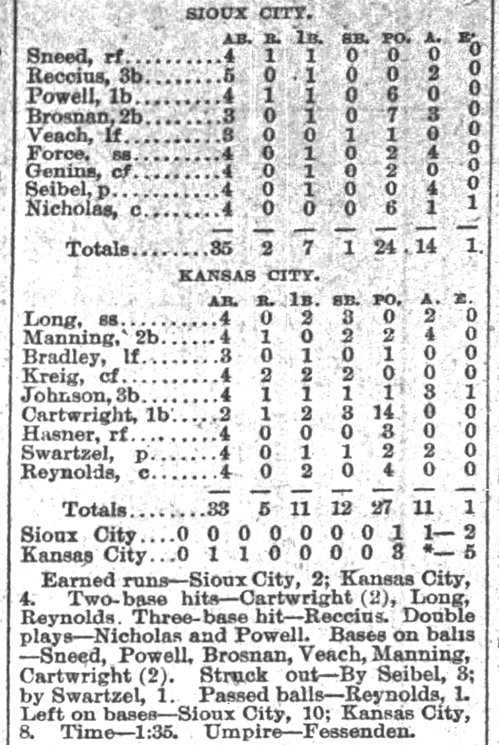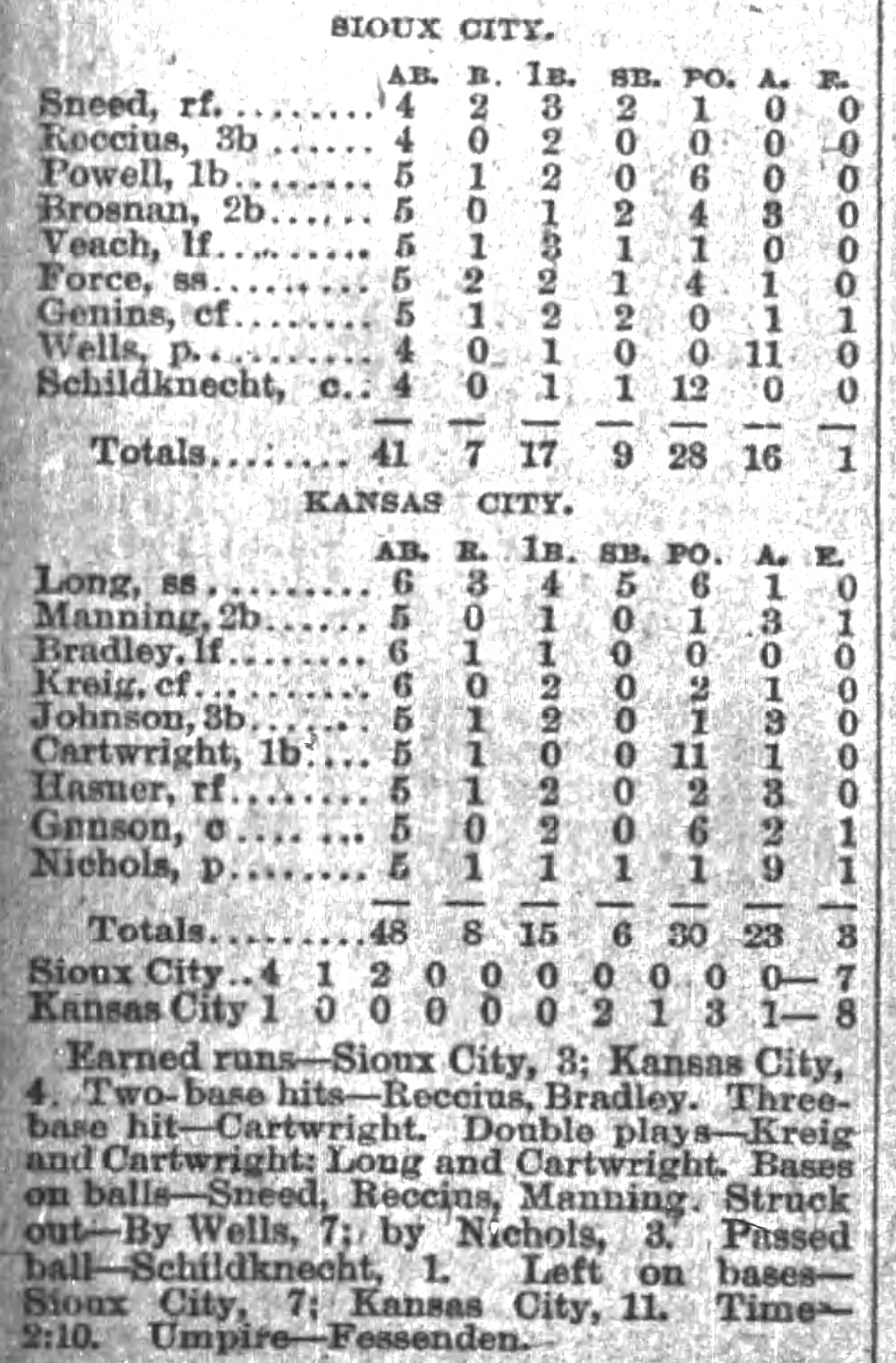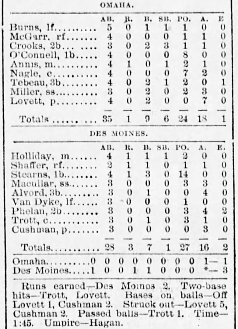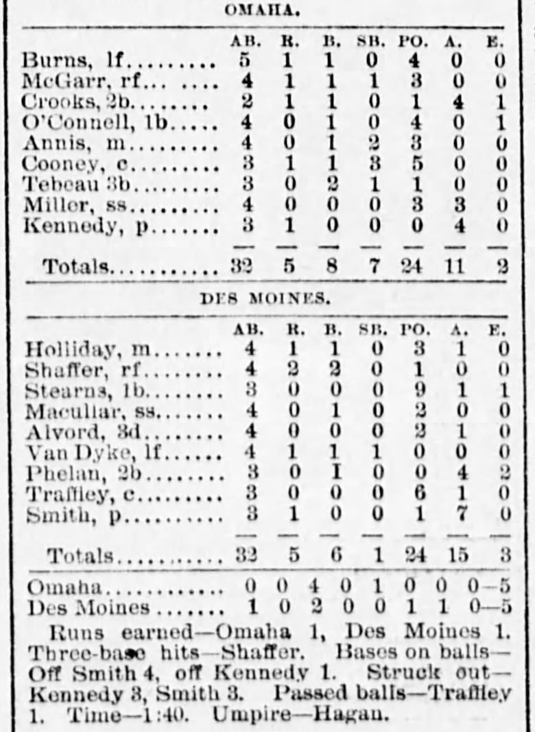 | Game 417: Des Moines @ Omaha Des Moines 3, Omaha 1 Omaha Daily Bee ![]() Game 1 | Game 418: Des Moines @ Omaha Omaha 5, Des Moines 5 Omaha Daily Bee ![]() Game 2 | Game 419: Kansas City @ Sioux City Kansas City 8, Sioux City 7 Sioux City Journal ![]() Game 1 | Game 420: Kansas City @ Sioux City Kansas City 5, Sioux City 2 Sioux City Journal ![]() Game 2 |