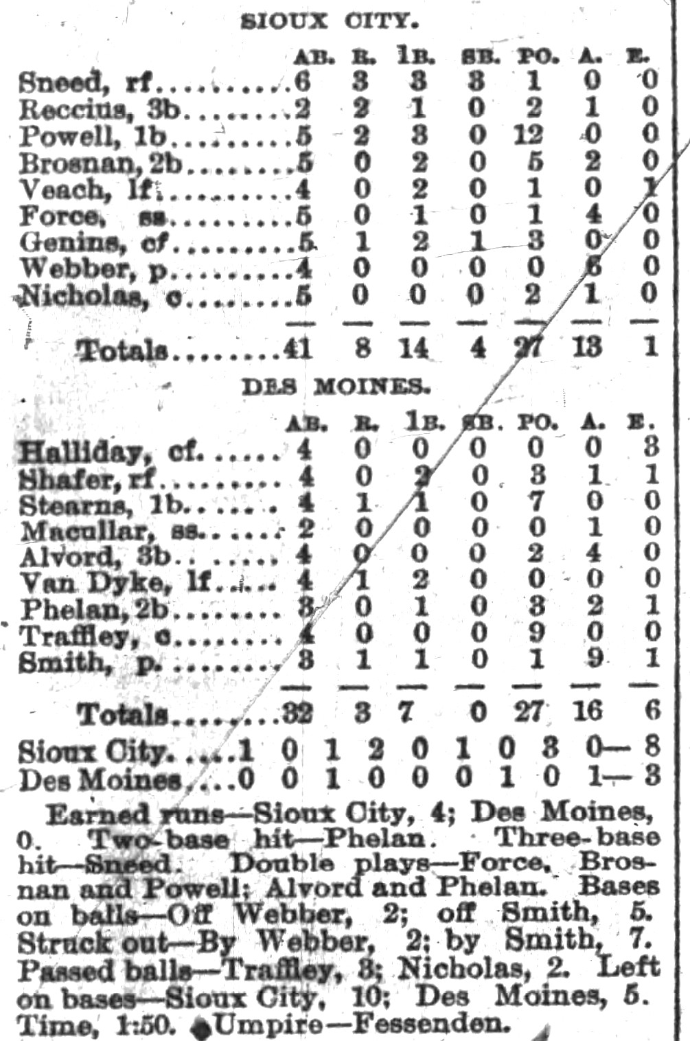 Team Games Wins Losses Ties Pct.Des Moines 107 69 38 3 0.645 Kansas City 107 67 40 0 0.626 St. Paul 108 67 41 4 0.620 Omaha 112 62 50 1 0.554 Milwaukee 115 56 59 4 0.487 Chicago 110 41 69 3 0.373 Sioux City 65 24 41 0 0.369 St. Louis 39 14 25 0 0.359 Minneapolis 81 29 52 1 0.358 Davenport 20 3 17 0 0.150