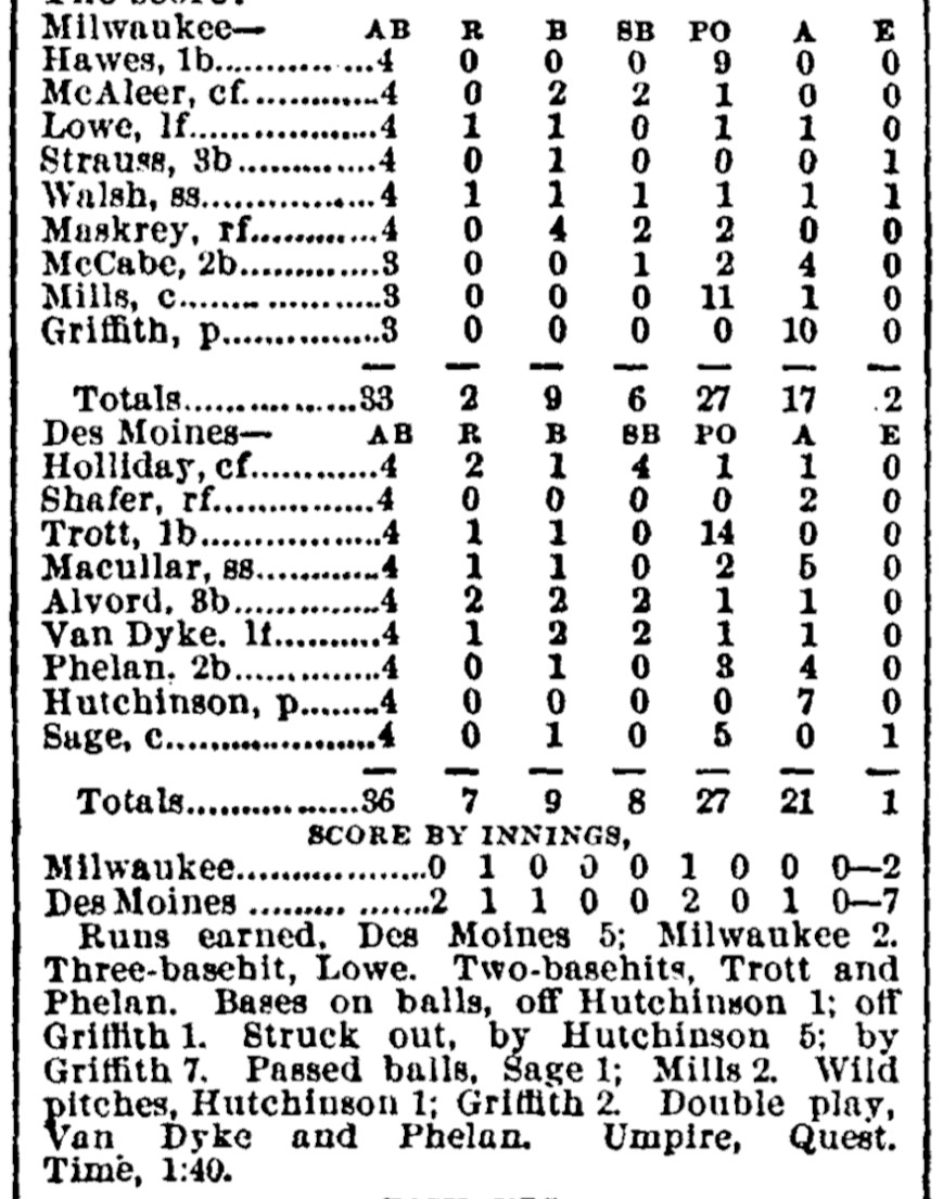 | Game 462: Des Moines @ Milwaukee Des Moines 7, Milwaukee 2 Milwaukee Sentinel ![]() | Game 463: Omaha @ St. Paul Omaha 2, St. Paul 1 St. Paul Globe ![]() |