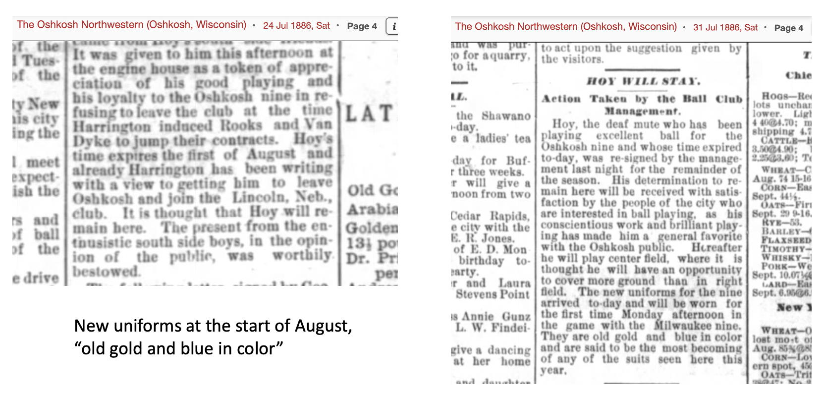 At the beginning of August, the Oshkosh club got new uniforms. According to the Oshkosh Northwestern, the uniforms were "old gold and blue." One possibility is that this photo was taken to show off the new uniforms, first used in the game on August 2, 1886. Given when Krock and Burns joined the club (by mid-August), this would put the photo sometime towards the end of August. Frank Bishop was witht he club all season, until mid-September. He is sure to be in the photo. Bart Duane was with the club intermittantly during the season, until he was released on September 7. He is probably also in the photo. That leaves three possible players for the remaining unmatched player - Ed McKenna, John Green, and James Gallagher. Based on the appearance of Burns, that would suggest that Green and McKenna would not be in the photo. (In fact, on August 21, the Oshosh Northwestern reported that Green "disappeared so suddenly", and reported that Burns and Gallagher replaced Green and McKenna.) So Gallagher is likely the third player.