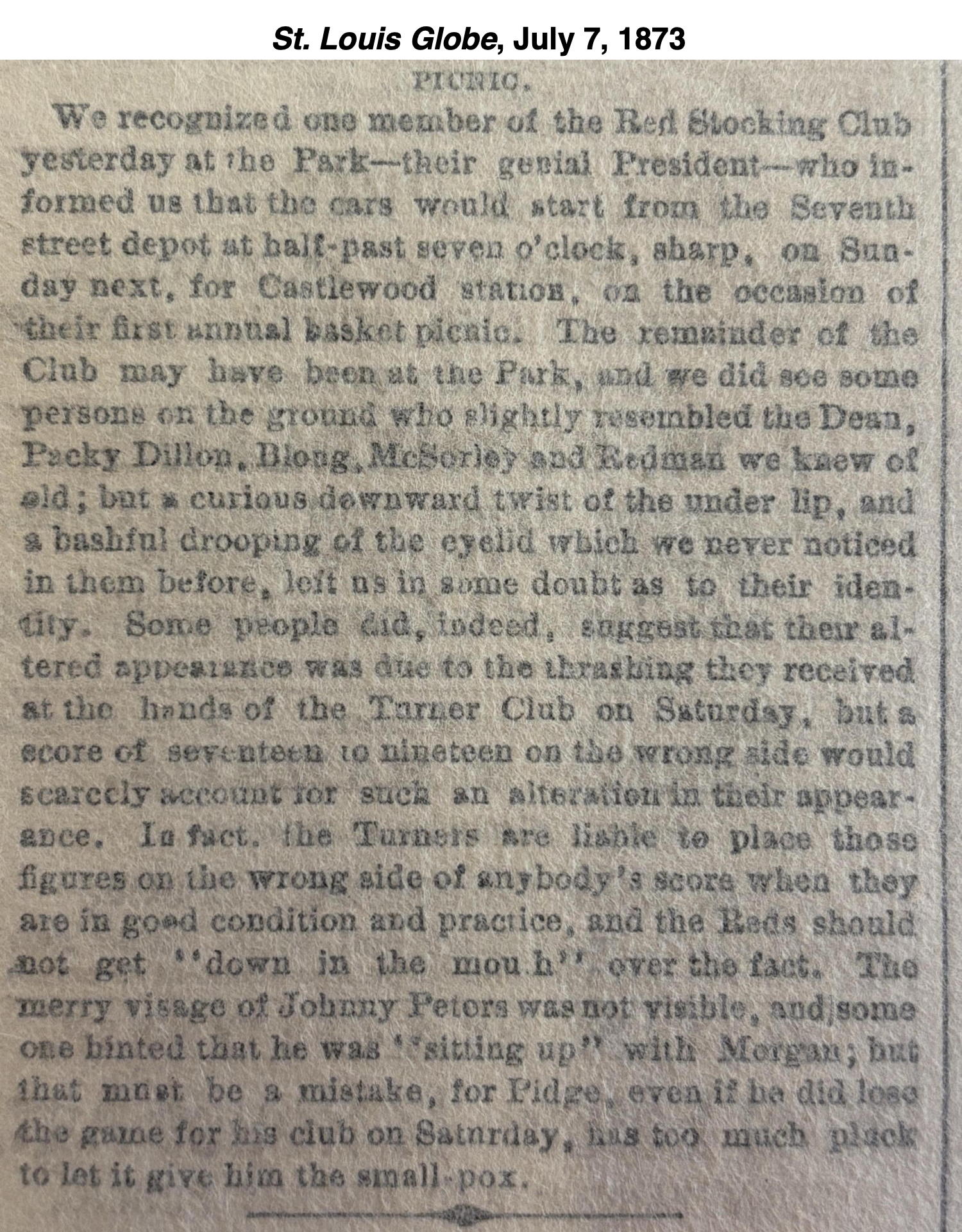 Not many other details were provided about the game itself. However, the Democrat also noted "By the way, we wish to state right here that if the base ball clubs wish to be patronized liberally, they have got to use respectful language. Yesterday the right fielder of the Red Stockings [McSorley] is said to have used such filthy language that the ladies in attendance had to leave the grounds."