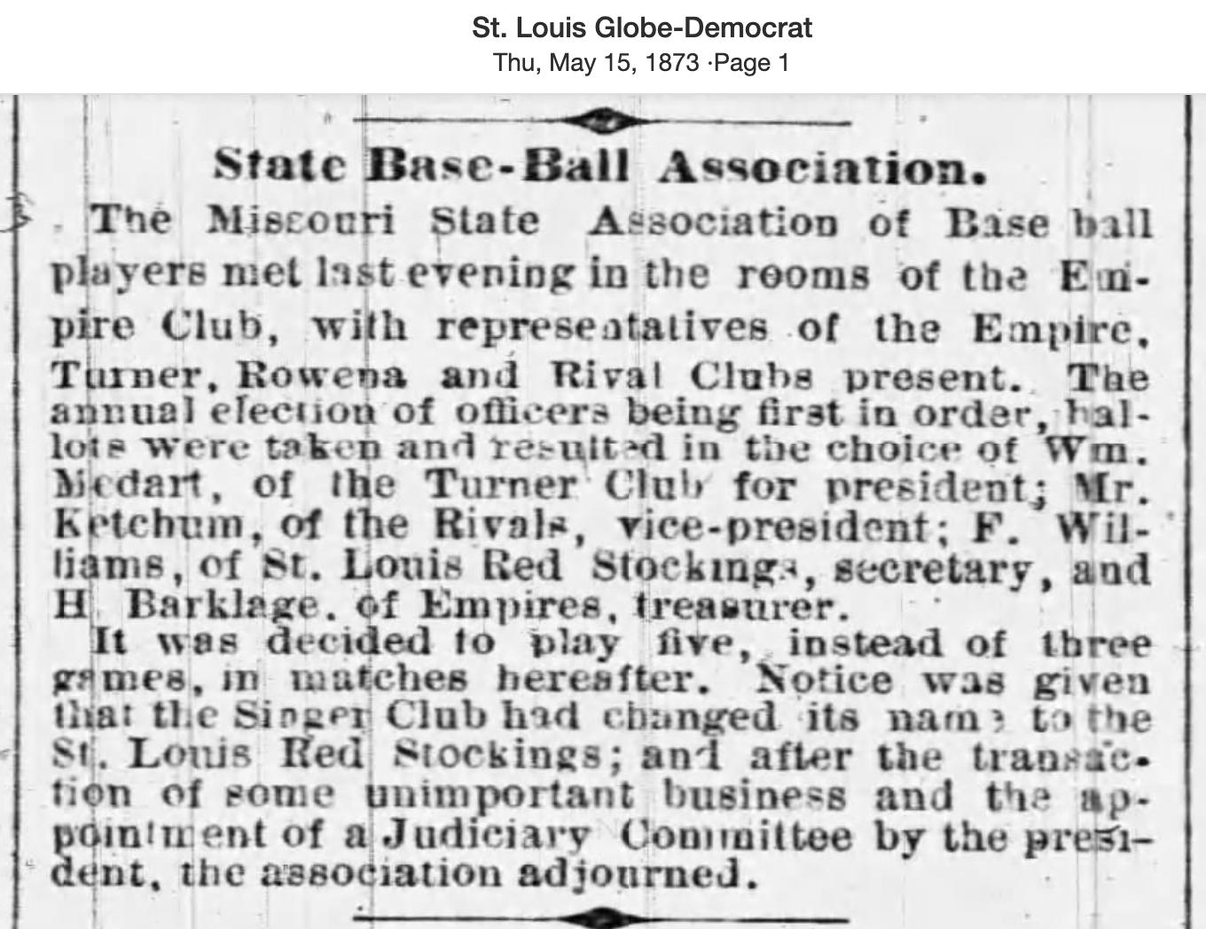 The St. Louis Red Stockings officially became the St. Louis Red Stockings at the organizational meeting of the Missouri State Association of Base ball players in the meeting rooms for the Empire Club on May 14, 1873. Prior to that evening, they were the Singer Red Stockings, the company club for Singer Manufacturing, which had a manufacturing site in St. Louis for its sewing machines. At the meeting that evening, they announced the name change to the St. Louis Red Stockings and their intent to compete for the amateur championship of Missouri. Five clubs (Empire, Turner, Rowena, Rival, and Red Stockings) agreed to play five match games against each of the other for the amateur state championship. The Empire, the defending champions, were the team to beat. Mr. F. Williams of the Red Stockings was chosen as Secretary of the Association.(1)