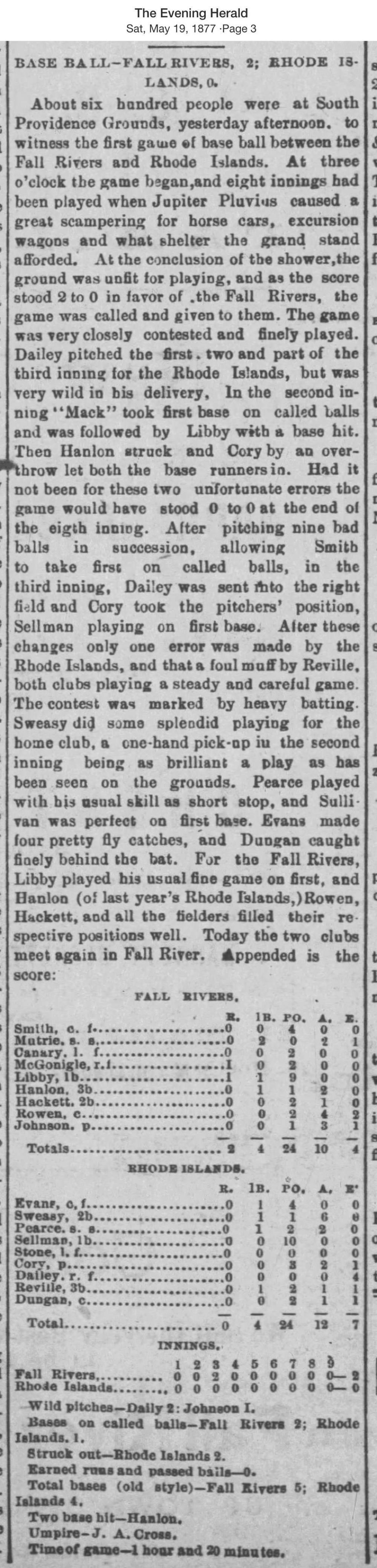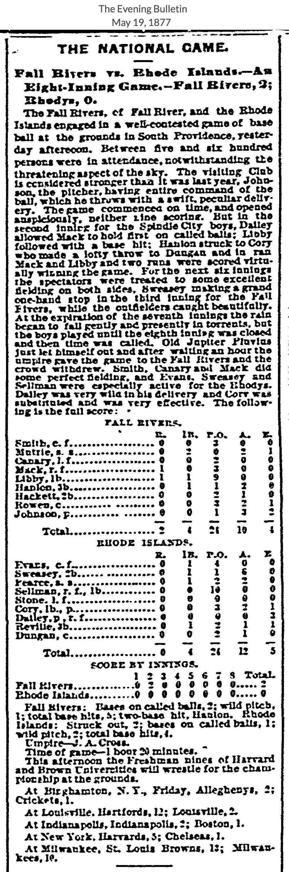 May 18, 1877 at ProvidenceRhode Island 0, Fall River 2GameID g05181877-04