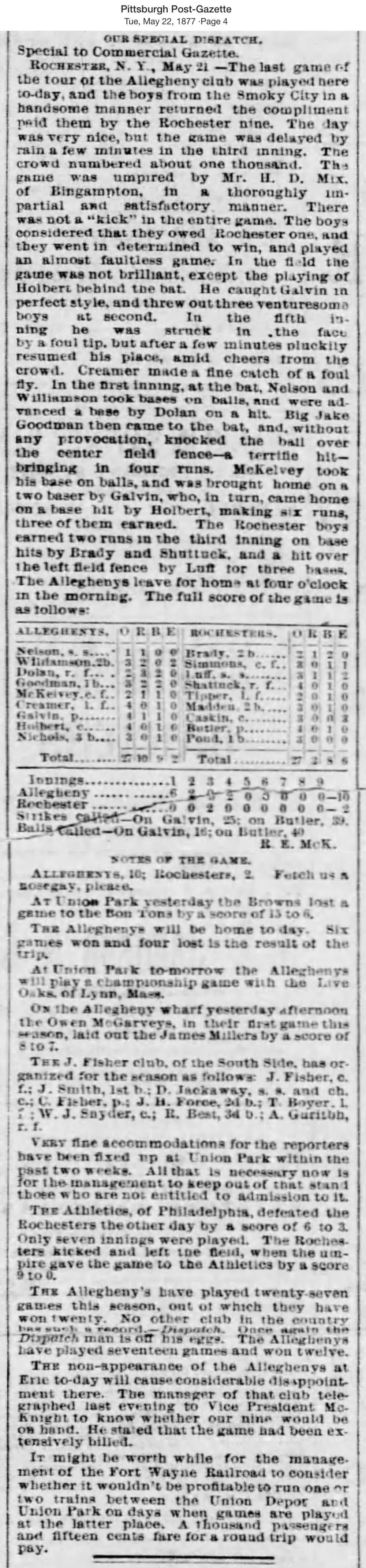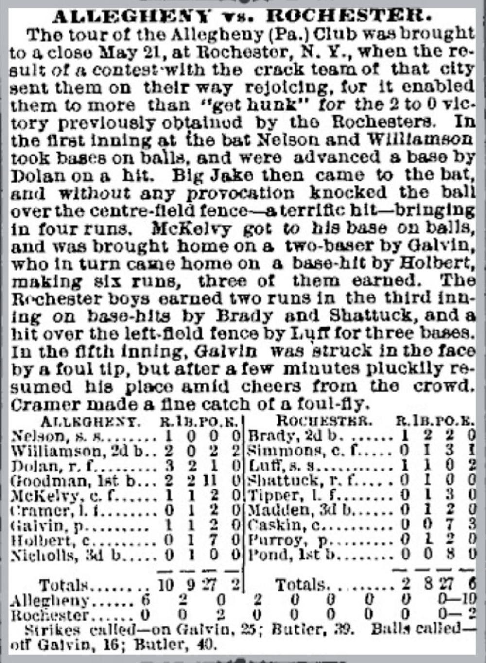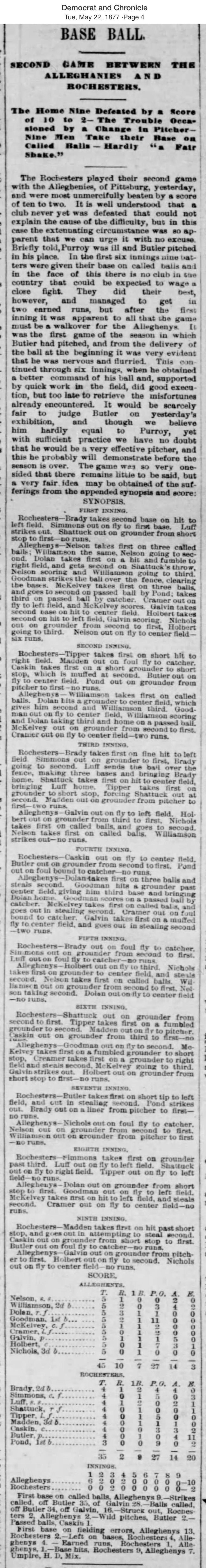 May 21, 1877 at RochesterRochester 2, Allegheny 10GameID g05211877-03