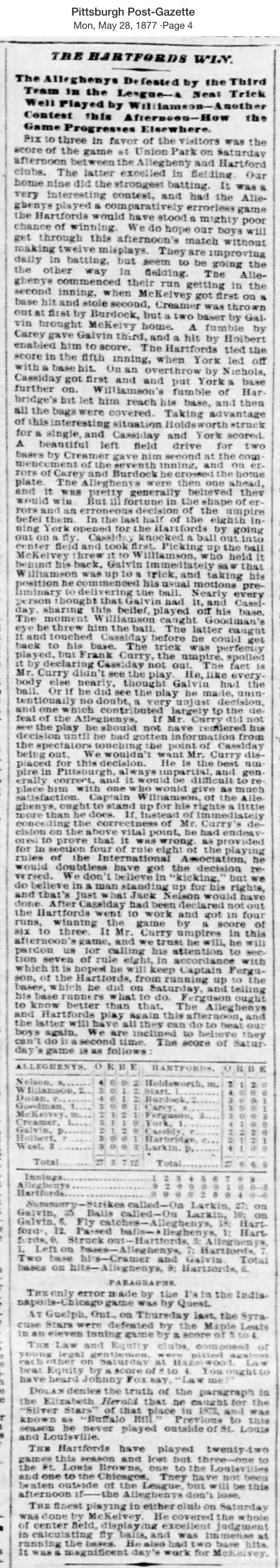 May 26, 1877 at AlleghenyAllegheny 3, Hartford 6GameID g05261877-01