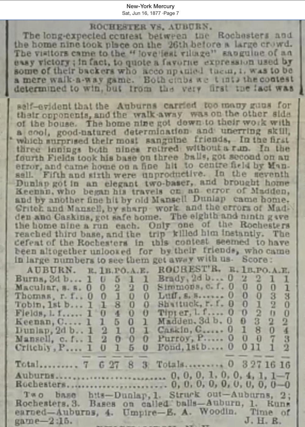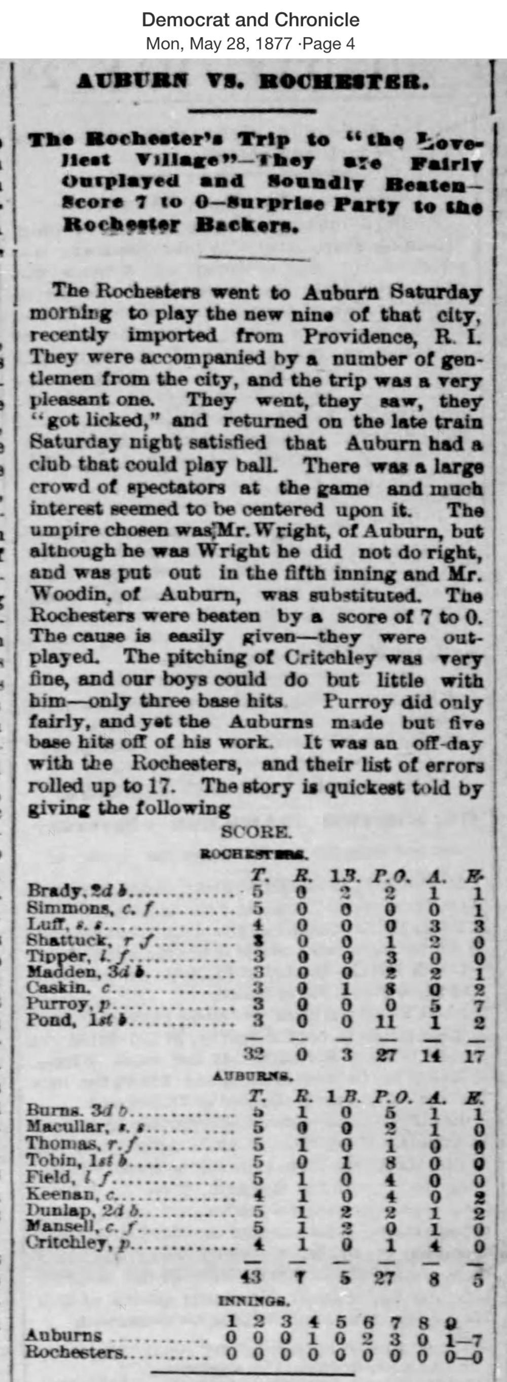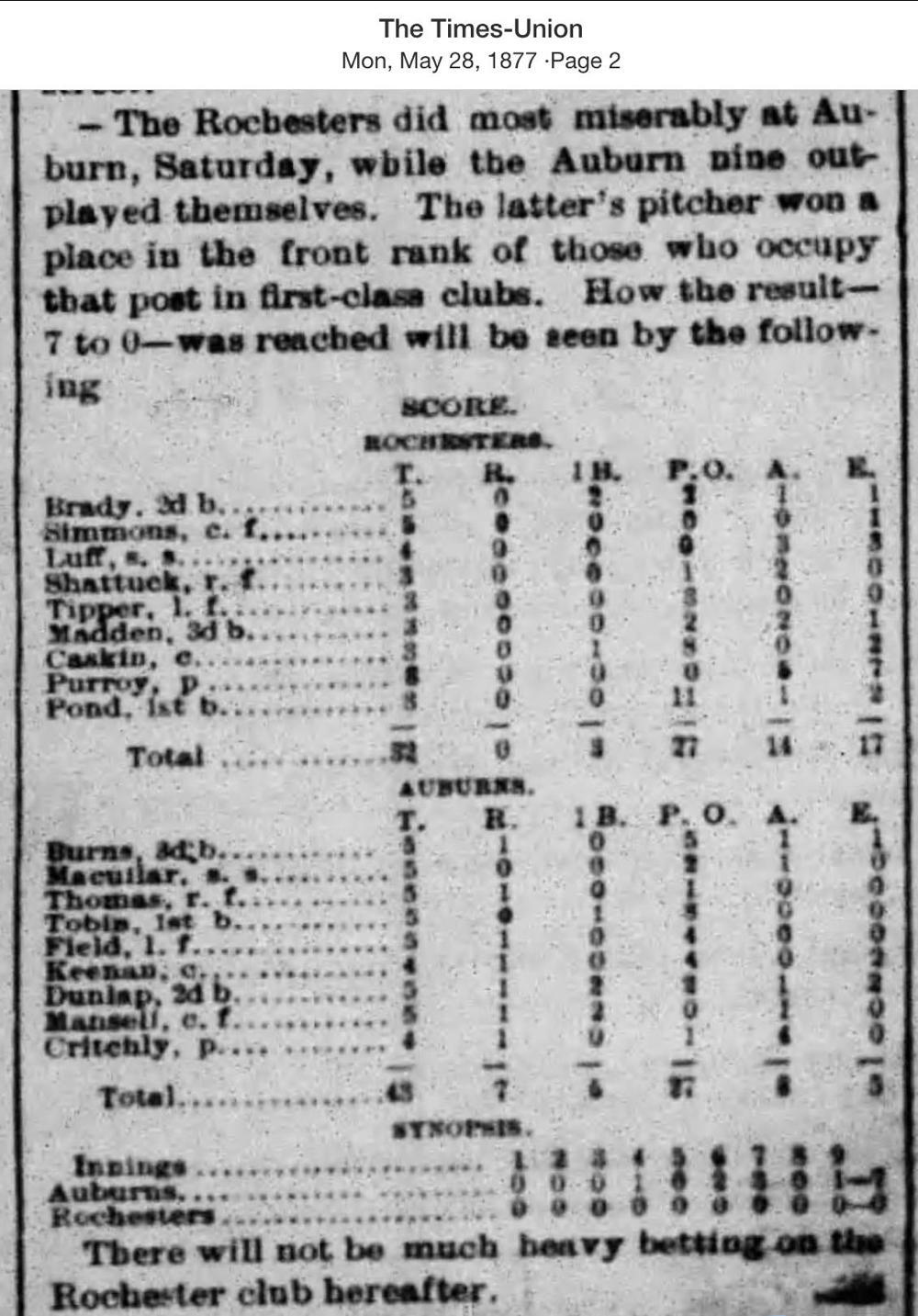 May 26, 1877 at AuburnAuburn 7, Rochester 0GameID g05261877-02