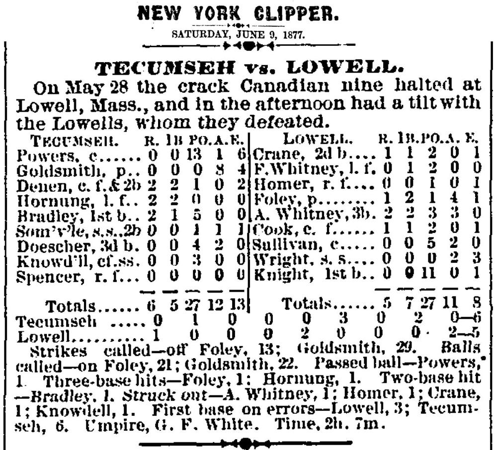 | 2b | Sam Crane | | lf | Frank Whitney | | rf | Homer | | p | Curry Foley | | 3b | Art Whitney | | cf | R F Cook | | c | Denny Sullivan | | ss | Sam Wright | | 1b | Lon Knight | | | Tecumseh