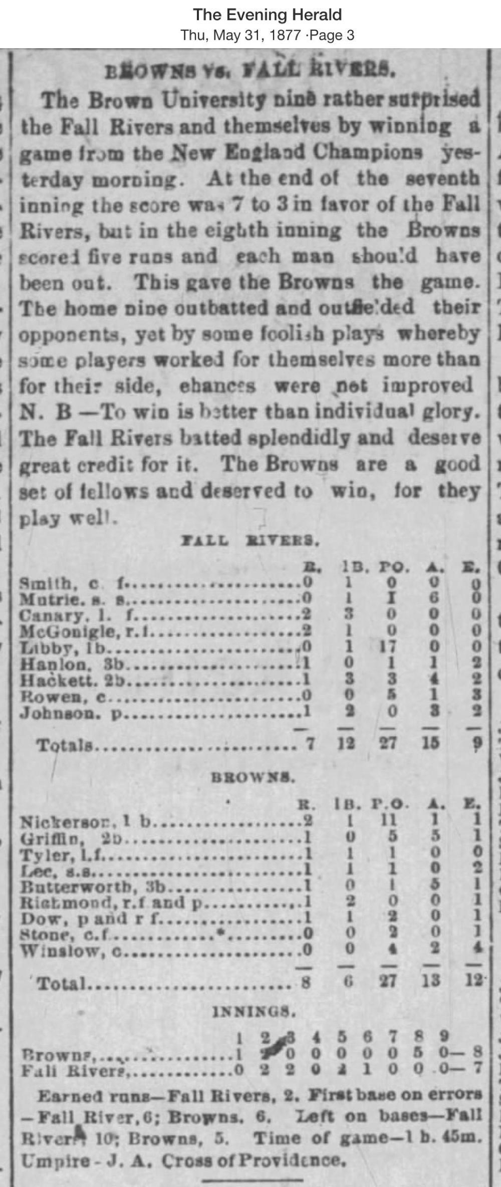 May 30, 1877 at Fall RiverFall River 7, Brown University 8GameID g05301877-03 Morning game
