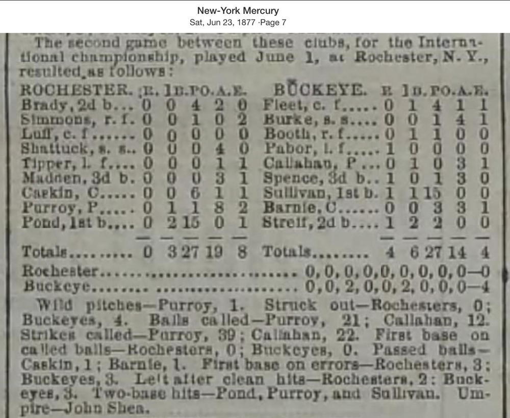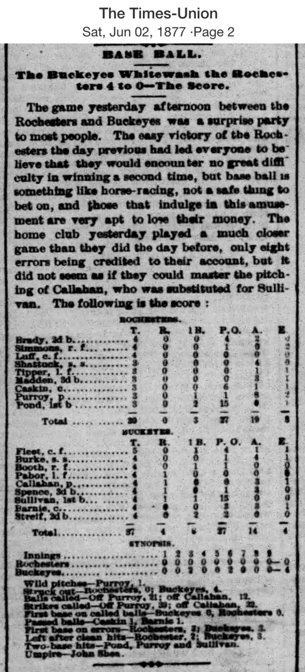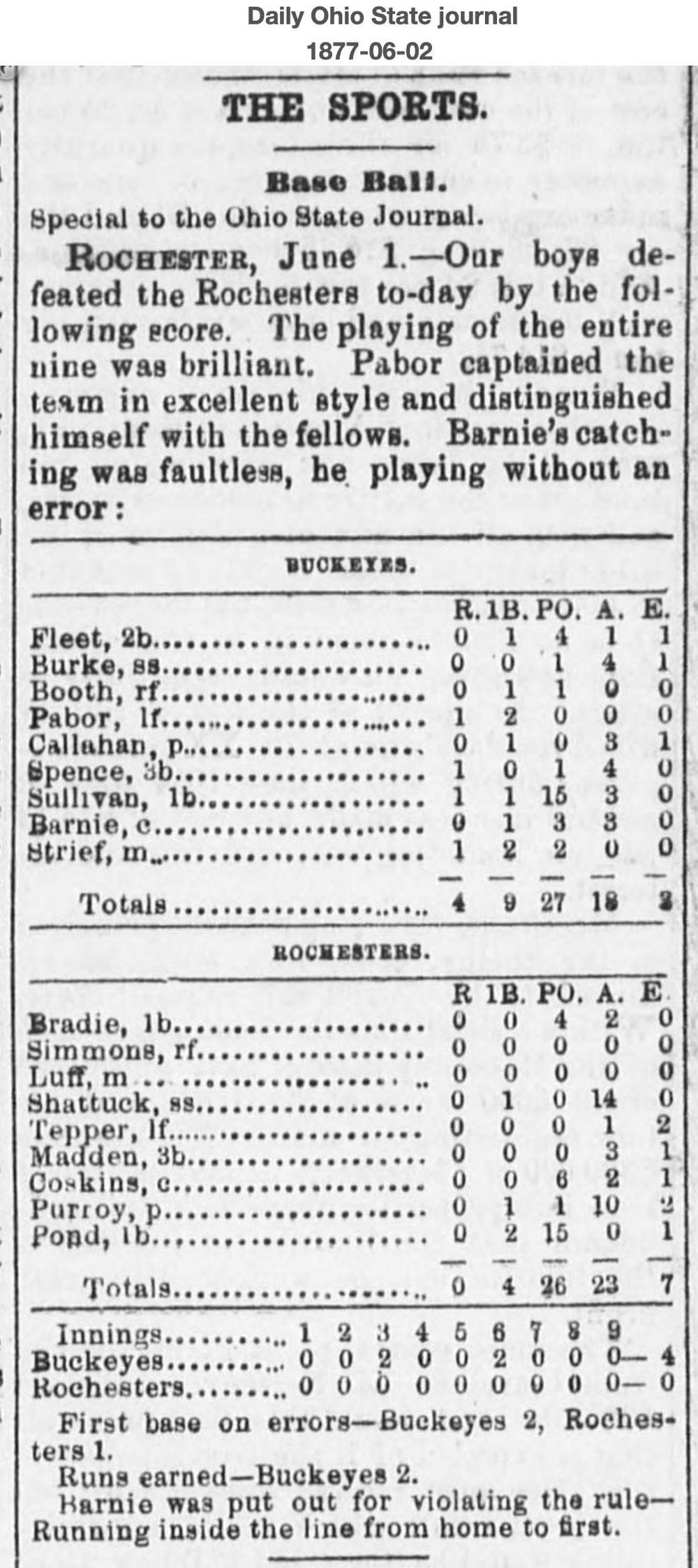June 1, 1877 at RochesterRochester 0, Buckeyes 4GameID g06011877-04