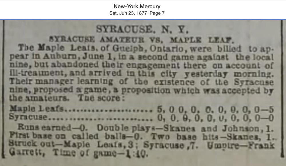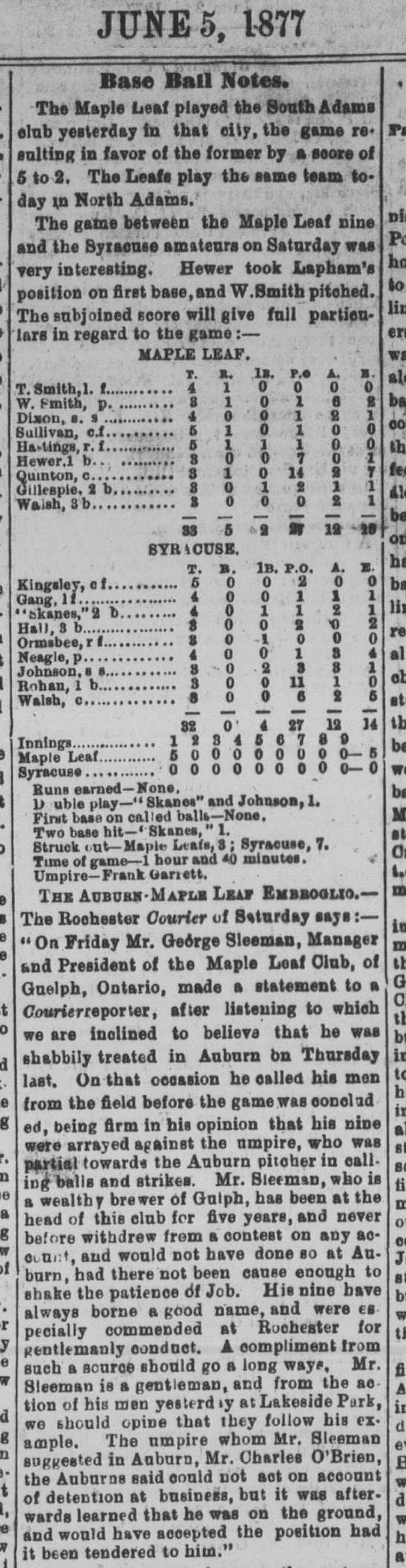 June 1, 1877 at SyracuseSyracuse Stars 0, Maple Leaf 5GameID g06011877-05
