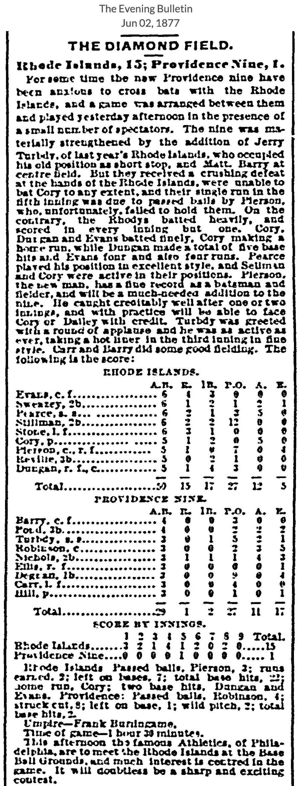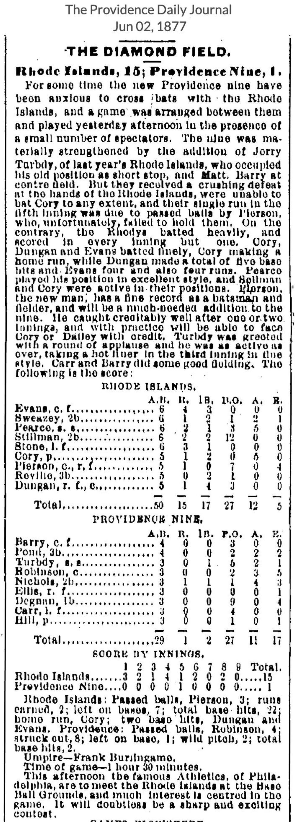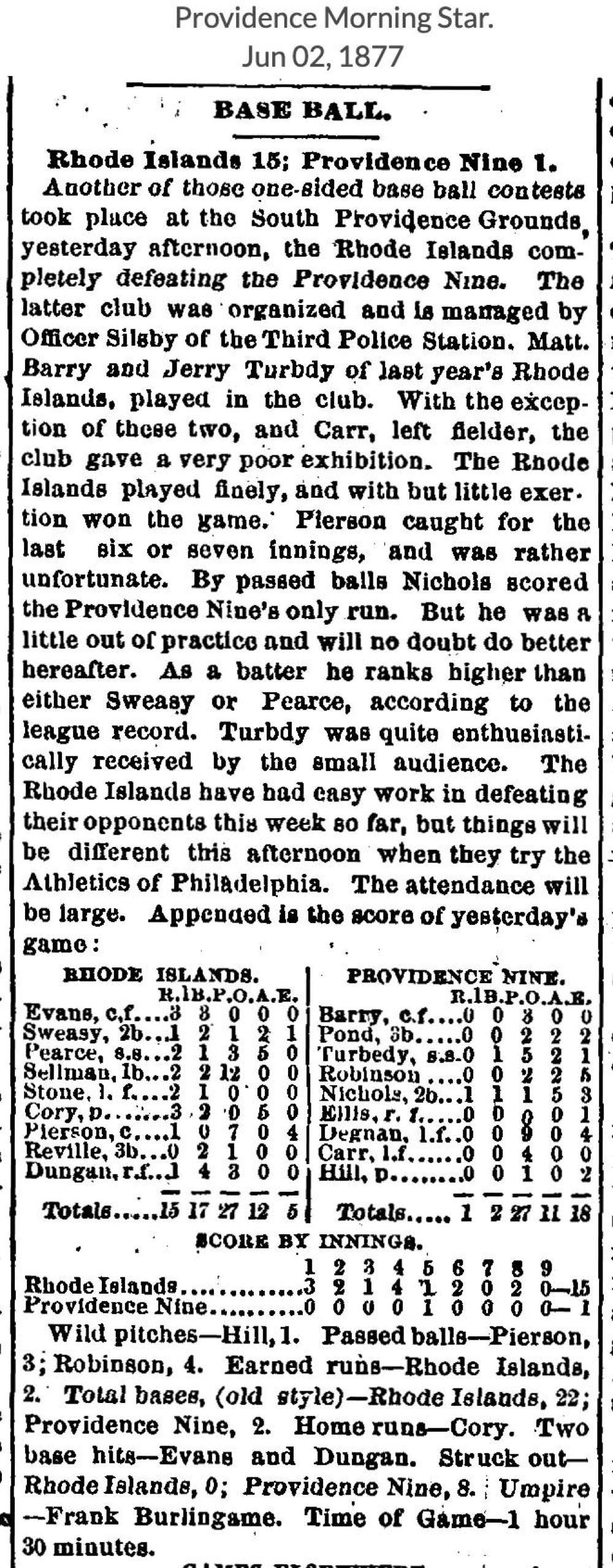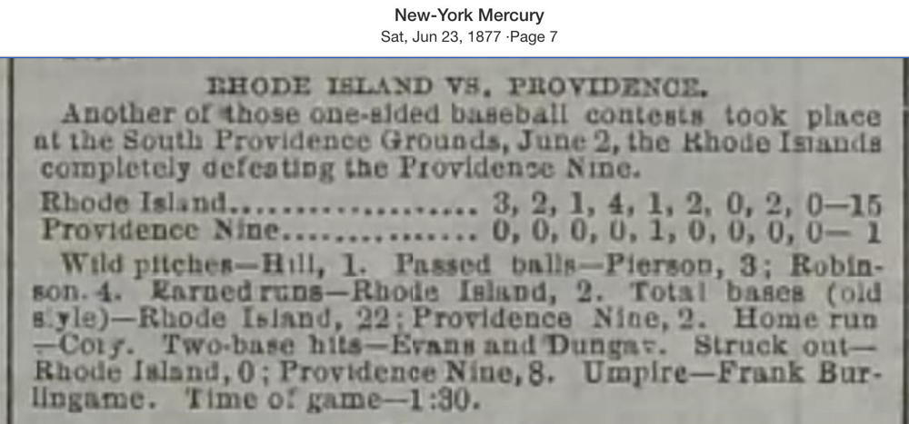 June 1, 1877 at ProvidenceRhode Island 15, Providence Nine 1GameID g06011877-06