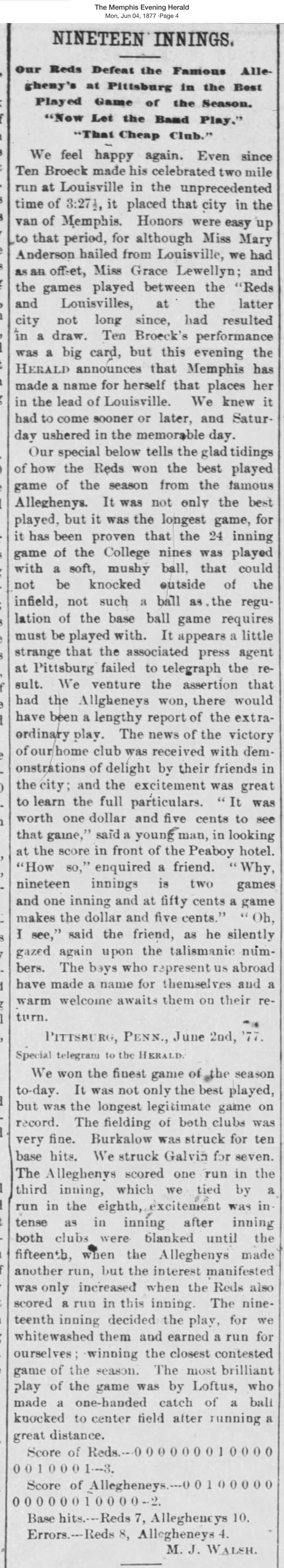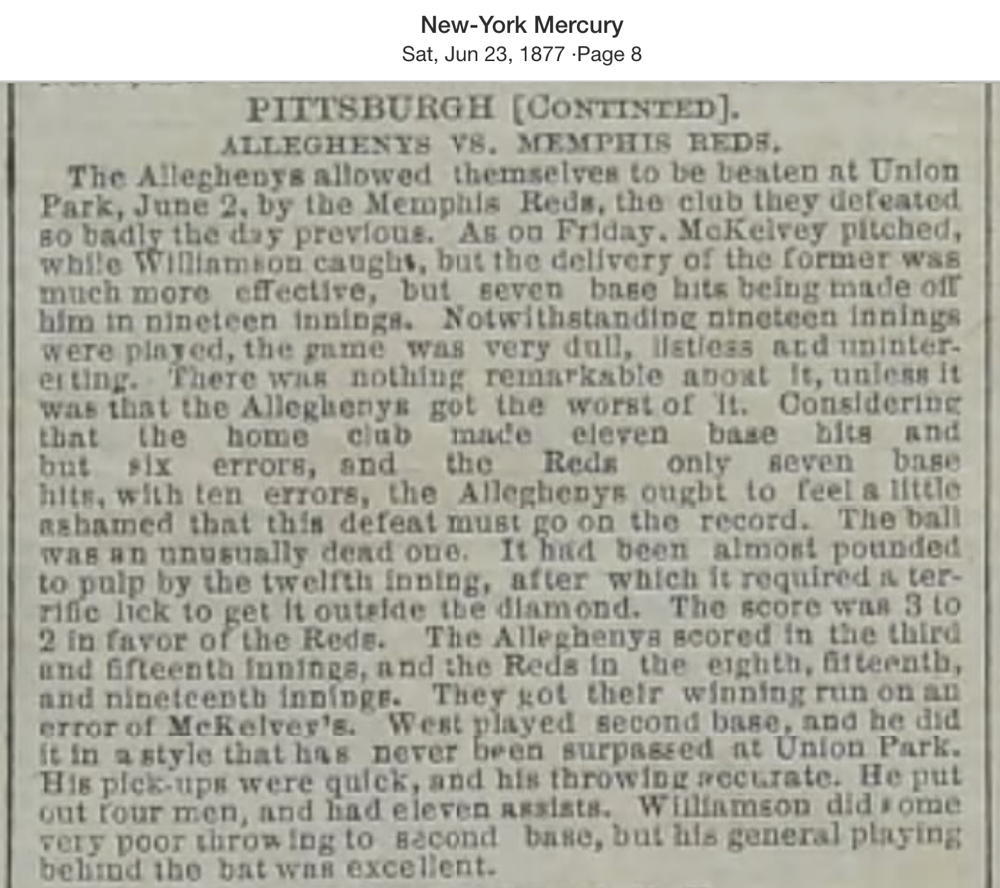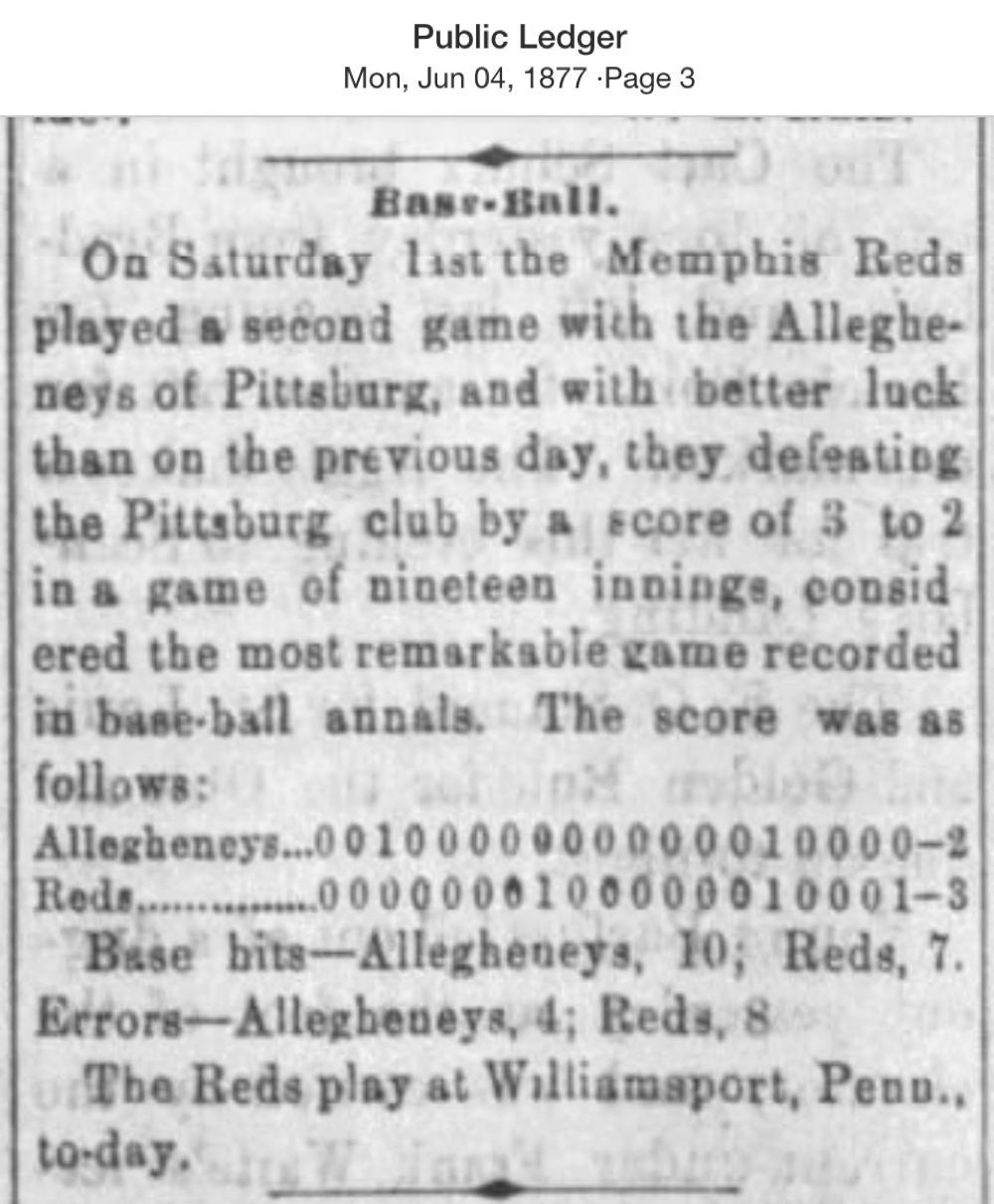 June 2, 1877 at AlleghenyAllegheny 2, Memphis Reds 3GameID g06021877-01 Nineteen innings