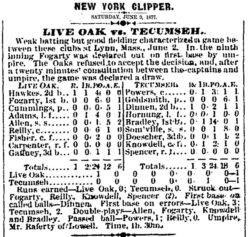 | 2b | Thorny Hawkes | | 1b | M J Fogarty | | p | Candy Cummings | | lf | George Adams | | ss | Jack Allen | | c | Charlie Reilley | | cf | George Fisher | | rf | Albert Carpenter | | 3b | John Gaffney | | | Tecumseh