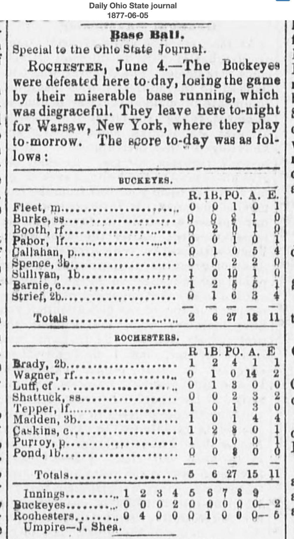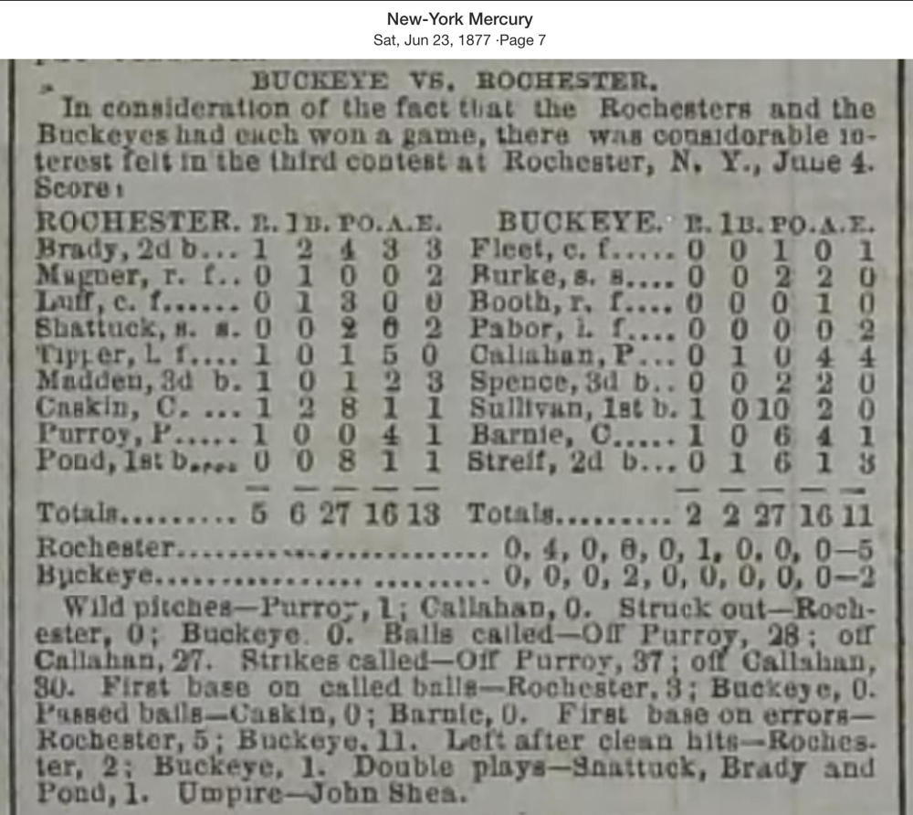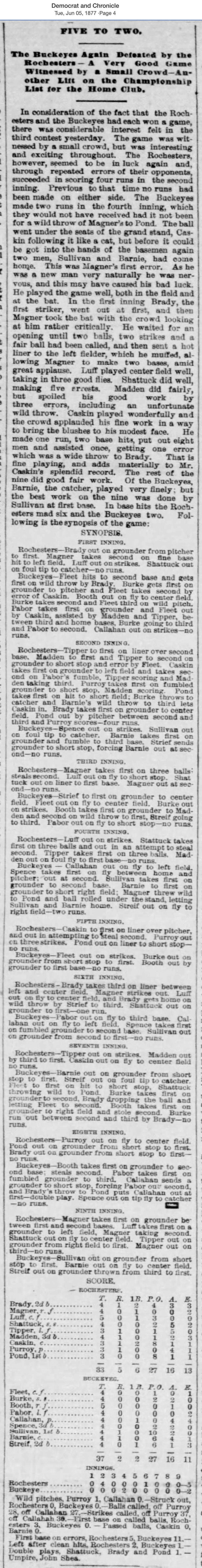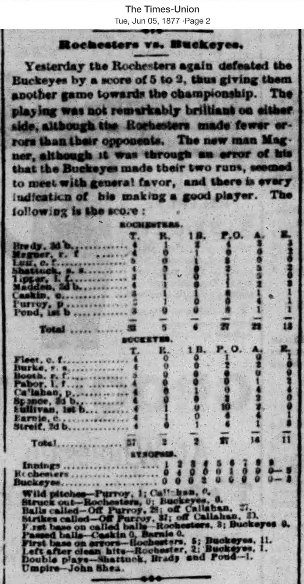 June 4, 1877 at RochesterRochester 5, Buckeyes 2GameID g06041877-04