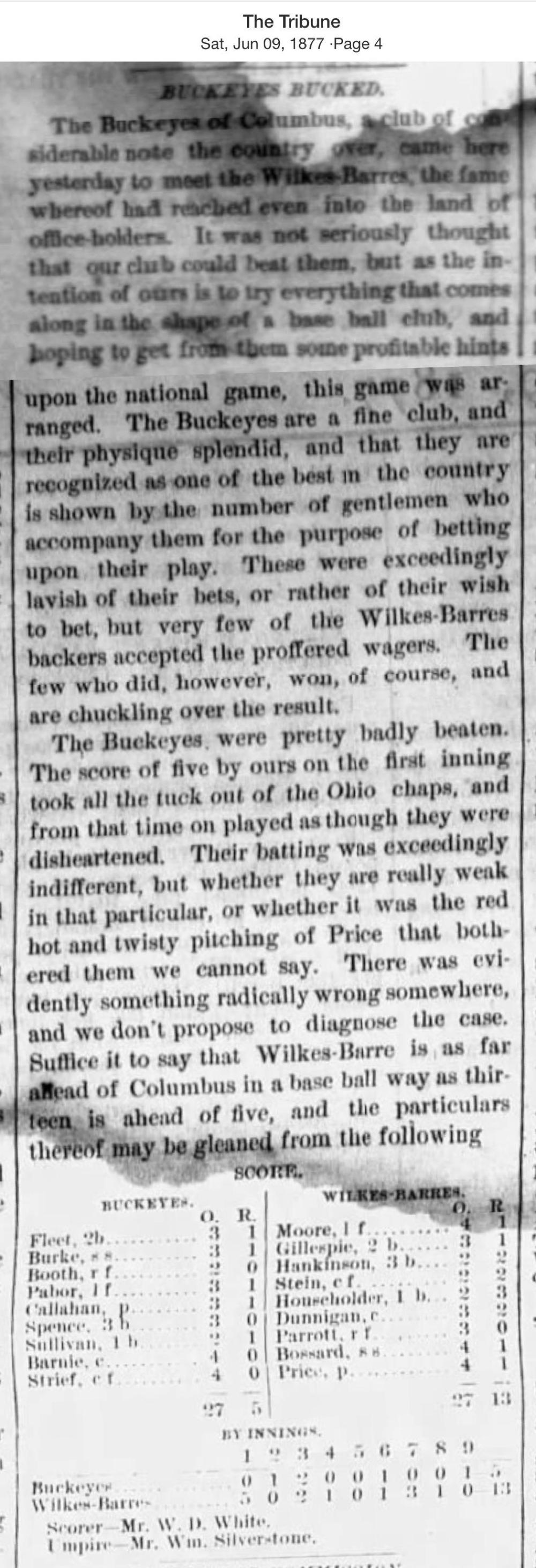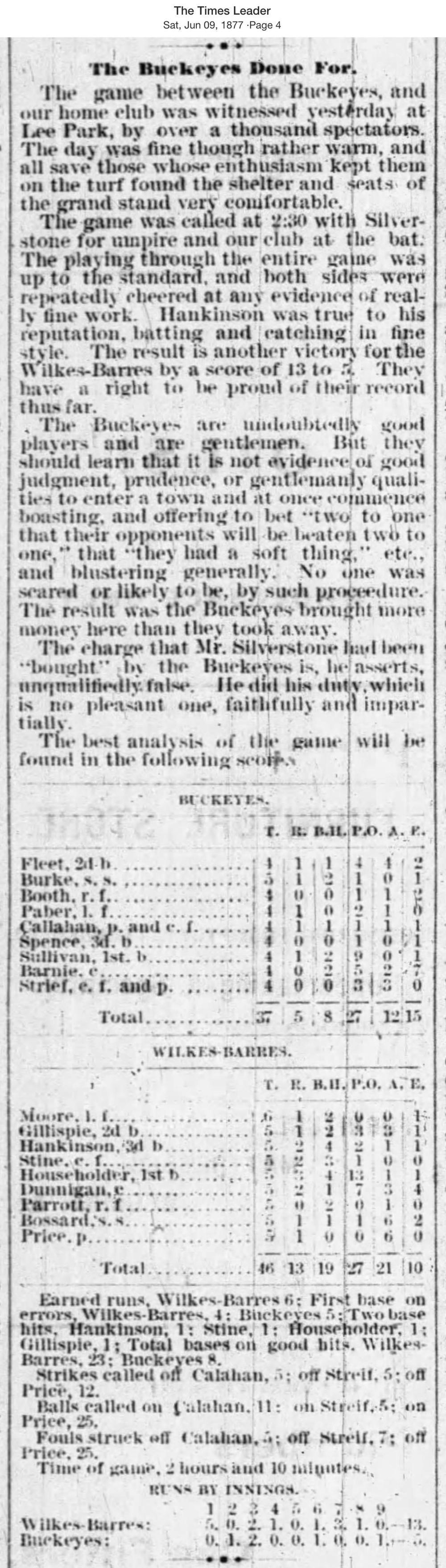 June 8, 1877 at WilkesbarreWilkesbarres 13, Buckeyes 5GameID g06081877-03