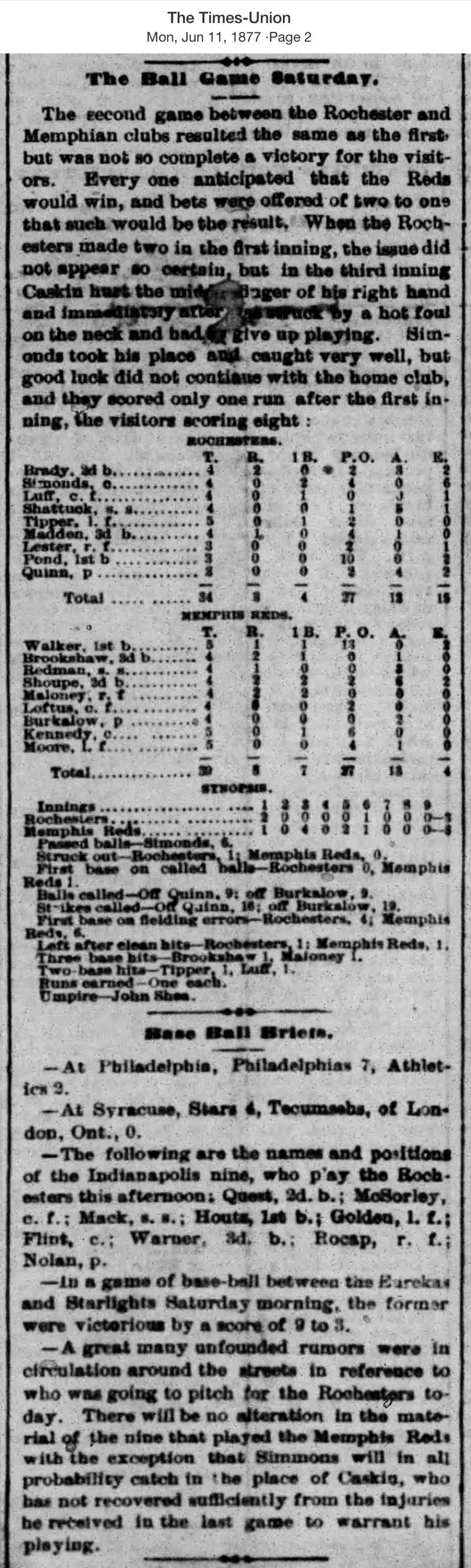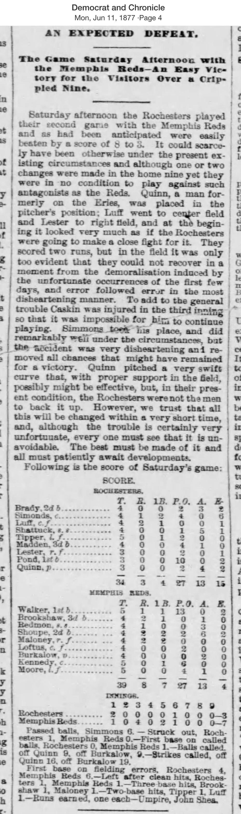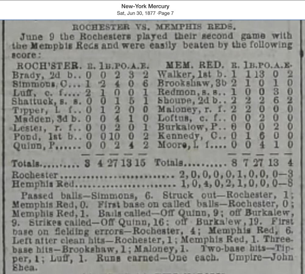 June 9, 1877 at RochesterRochester 3, Memphis Reds 8GameID g06091877-06