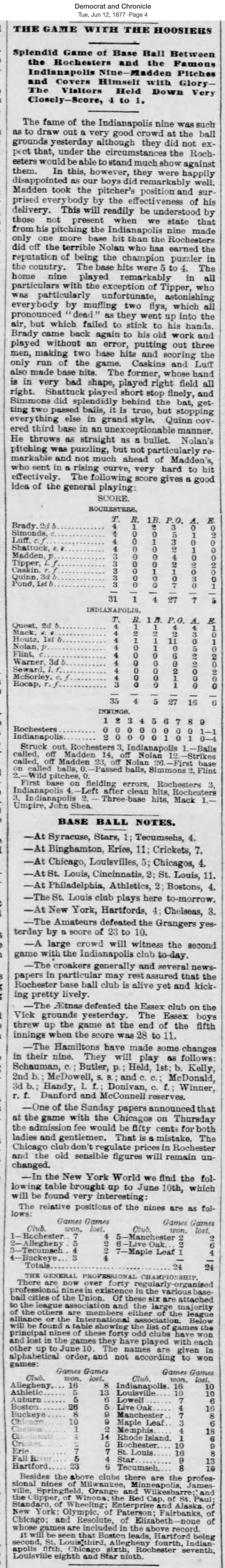 June 11, 1877 at RochesterRochester 1, Indianapolis 4GameID g06111877-04