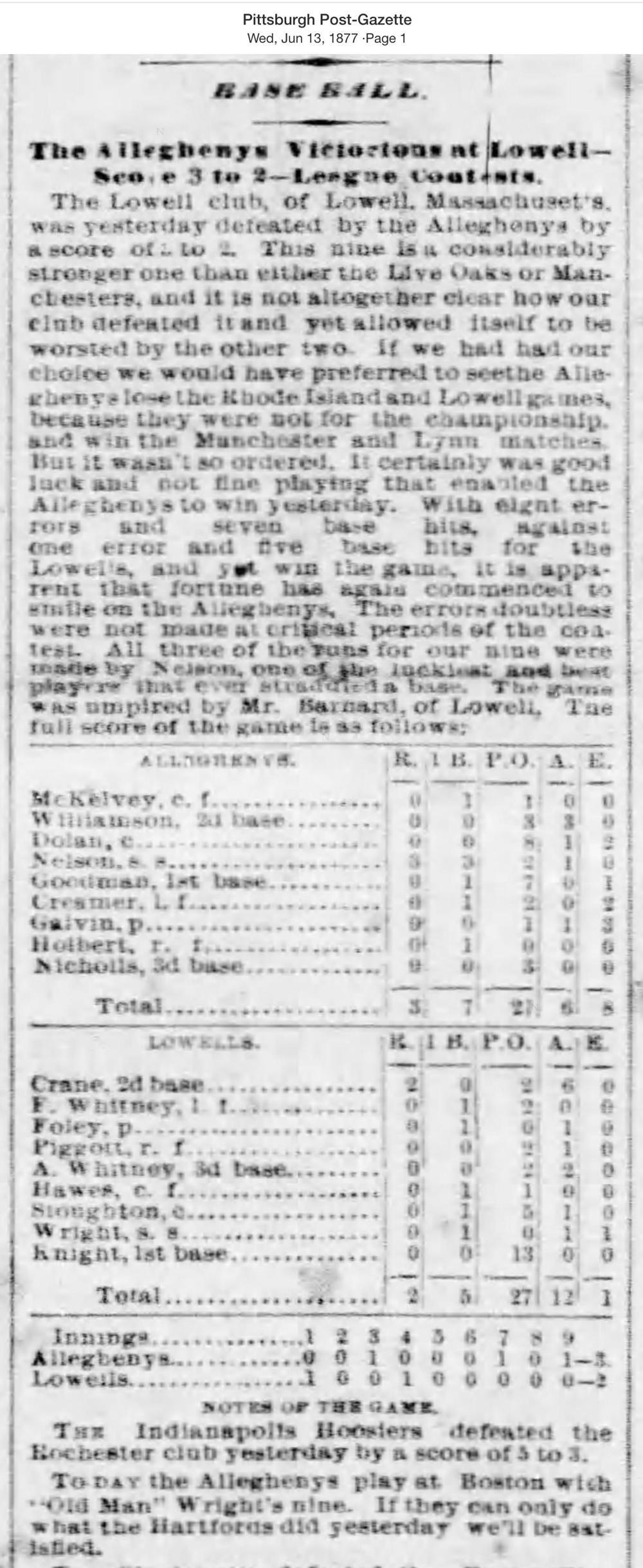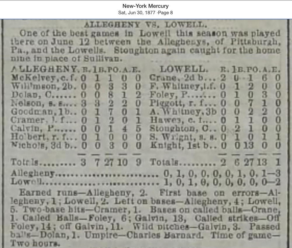 June 12, 1877 at Lowell, Mass.Lowell 2, Allegheny 3GameID g06121877-03