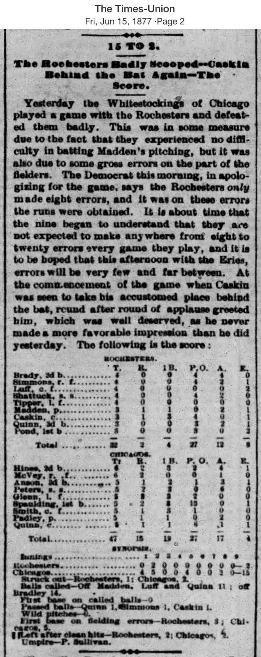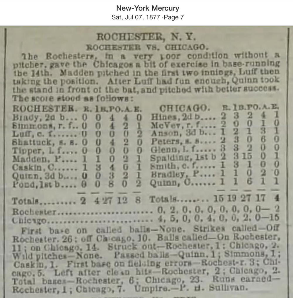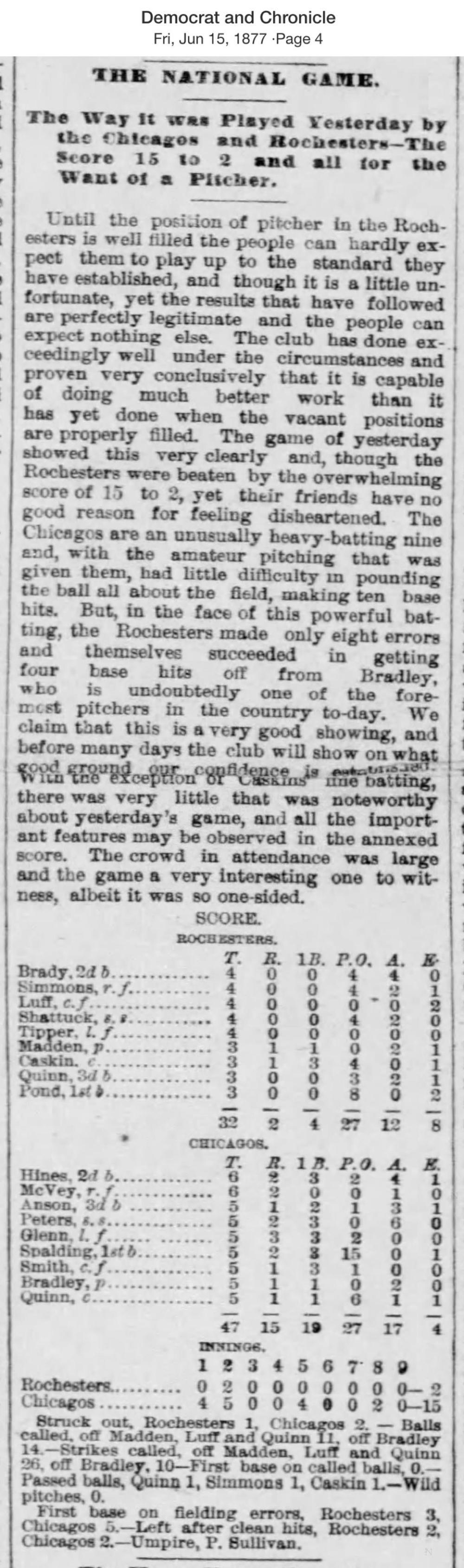 June 14, 1877 at RochesterRochester 2, Chicago 15GameID g06141877-03