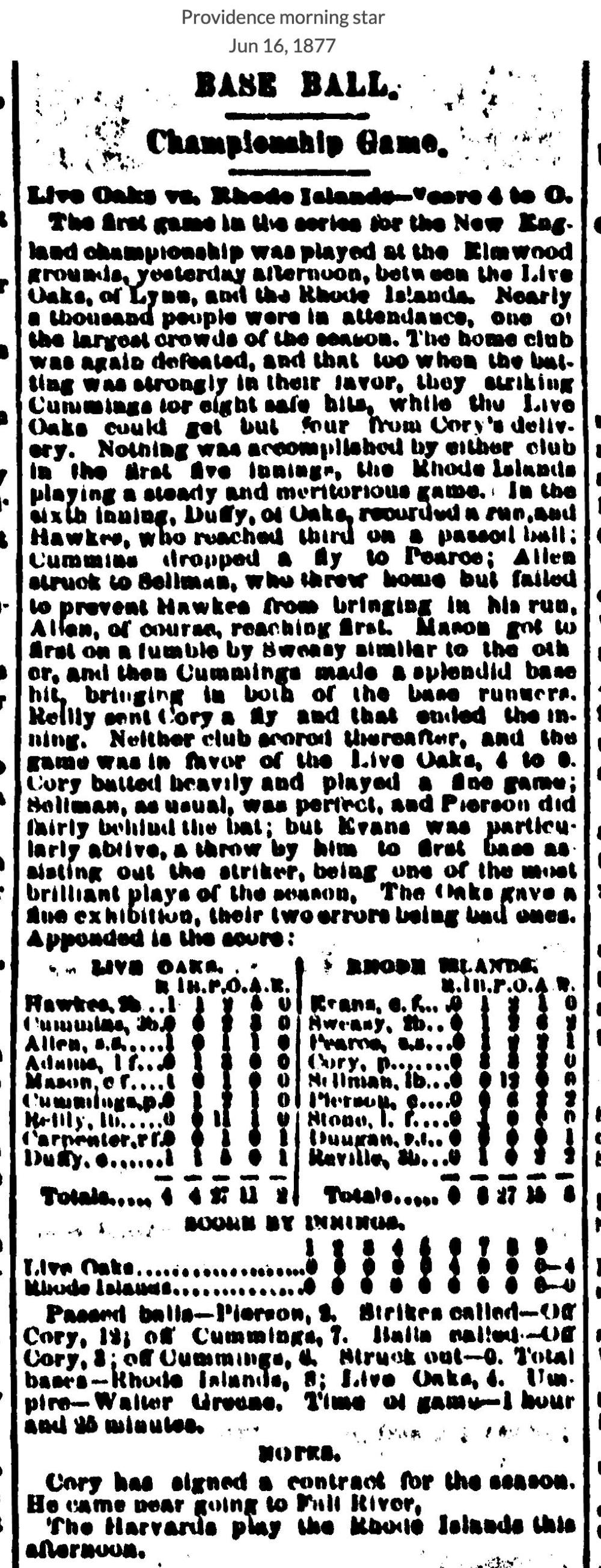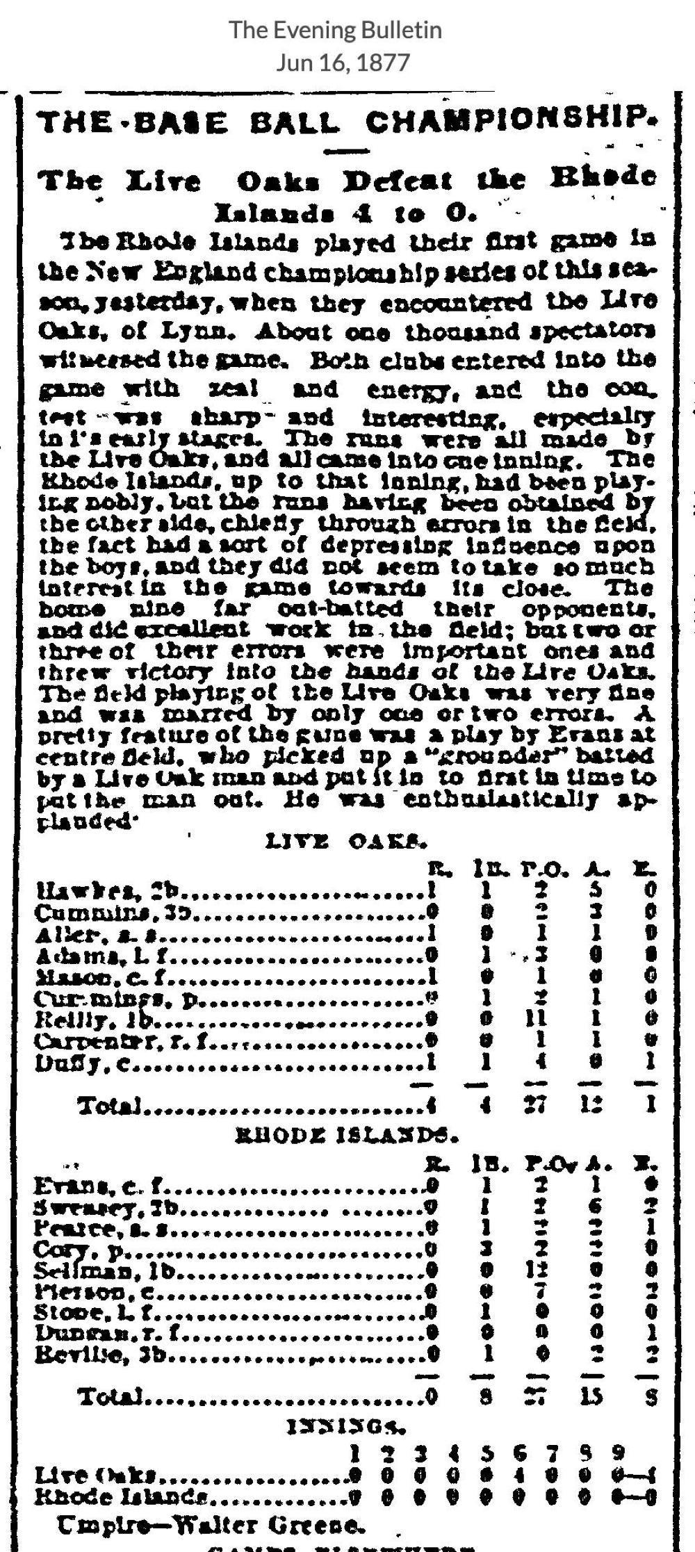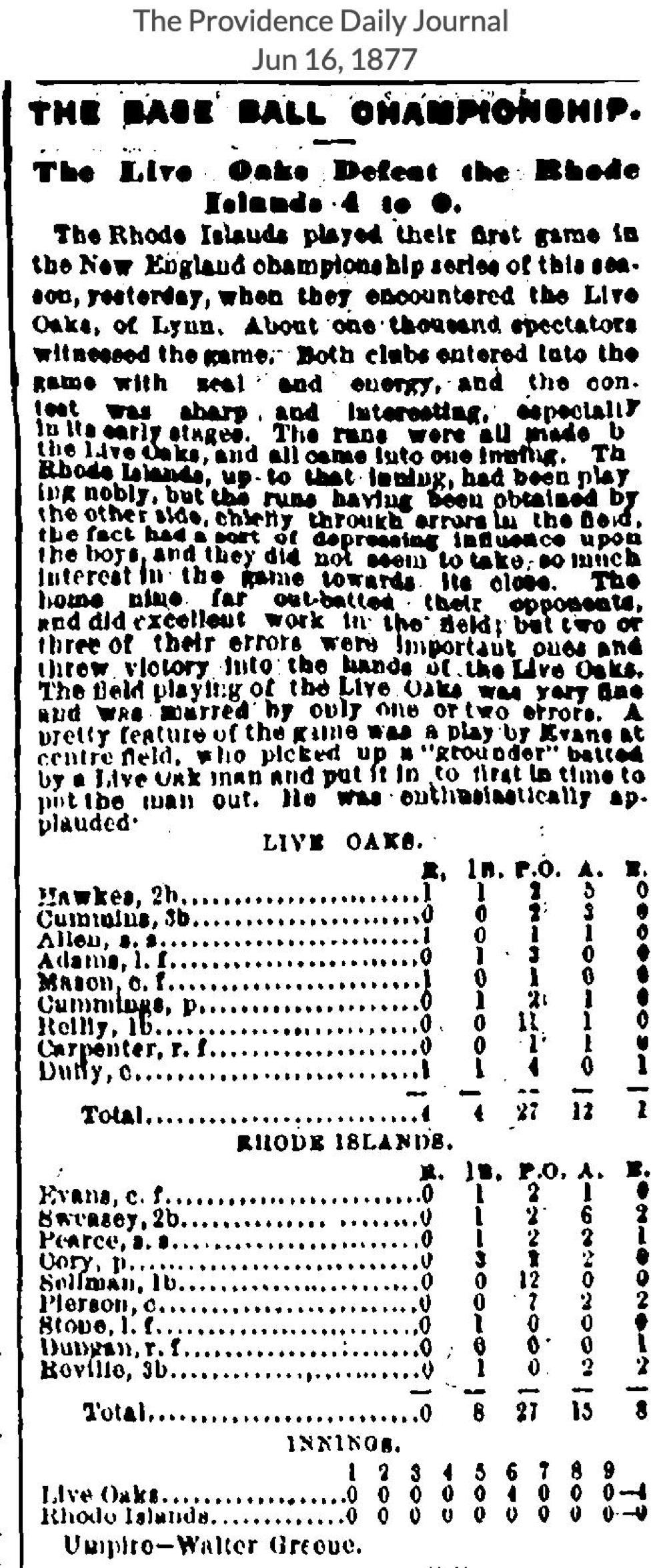 June 15, 1877 atLive Oak 4, Rhode Island 0GameID g06151877-01