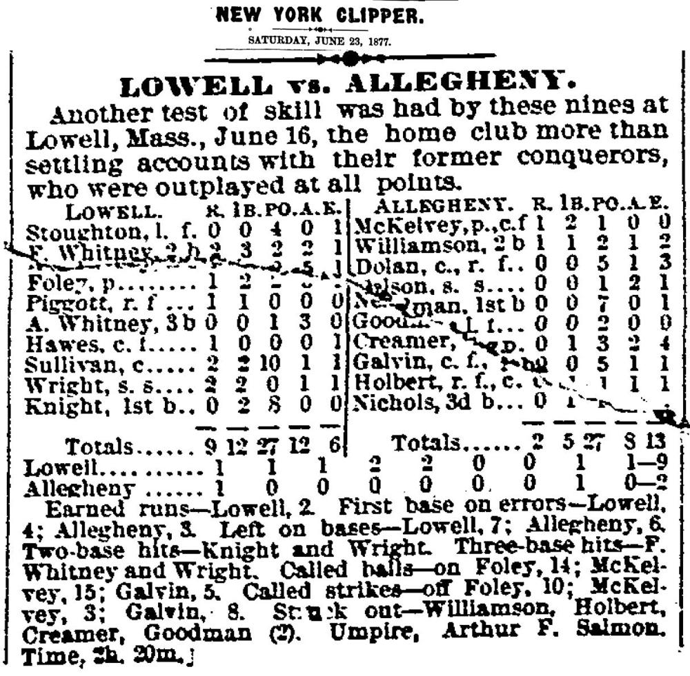 | lf | Eugene Stoughton | | 2b | Frank Whitney | | p | Curry Foley | | rf | John Piggott | | 3b | Art Whitney | | cf | Bill Hawes | | c | Denny Sullivan | | ss | Sam Wright | | 1b | Lon Knight | | | Allegheny